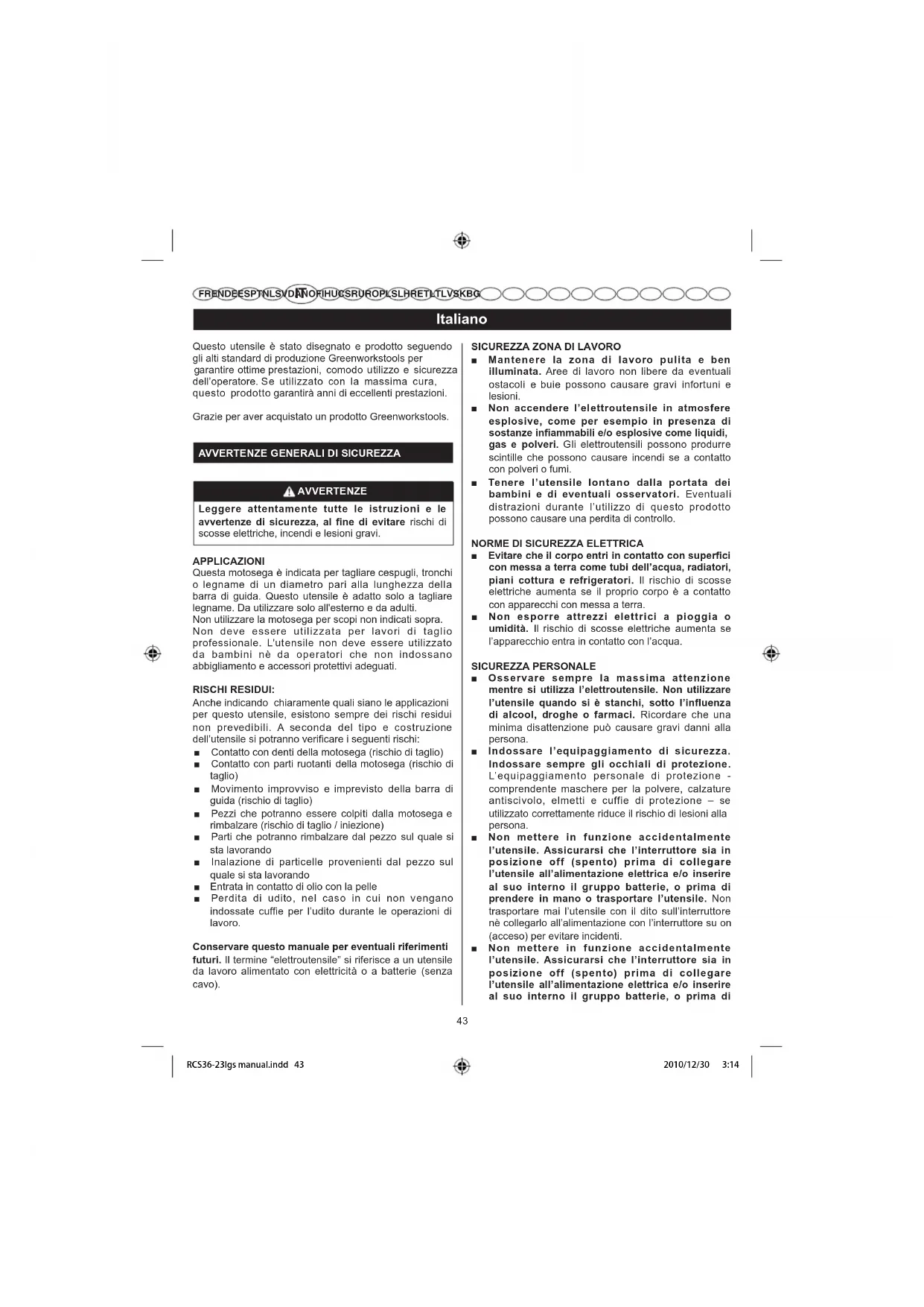 FR EN DE ES PT NL SV DA NO FI HU CS RU RO PL SL HR ET LT LV SK BG Questo utensile è stato disegnato e prodotto seguendo gli alti standard di produzione Greenworkstools per azzerucis e ozzilitu odomoc ,inoizatserp emitto eritnarag dell’operatore. Se utilizzato con la massima cura, questo prodotto garantirà anni di eccellenti prestazioni. Grazie per aver acquistato un prodotto Greenworkstools.