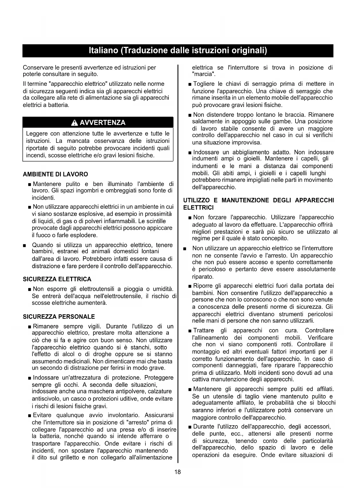 ■ Mantenere pulito e ben illuminato l'ambiente di lavoro. Gli spazi ingombri e ombreggiati sono fonte di incidenti. ■ Non utilizzare apparecchi elettrici in un ambiente in cui vi siano sostanze esplosive, ad esempio in prossimità di liquidi, di gas o di polveri infiammabili. Le scintille provocate dagli apparecchi elettrici possono appiccare il fuoco o farle esplodere. ■ Quando si utilizza un apparecchio elettrico, tenere bambini, estranei ed animali domestici lontani dall'area di lavoro. Potrebbero infatti essere causa di distrazione e fare perdere il controllo dell'apparecchio. SICUREZZA ELETTRICA ■ Non esporre gli elettroutensili a pioggia o umidità. Se entrerà dell'acqua nell'elettroutensile, il rischio di scosse elettriche aumenterà. SICUREZZA PERSONALE ■ Rimanere sempre vigili. Durante l'utilizzo di un apparecchio elettrico, prestare molta attenzione a ciò che si fa e agire con buon senso. Non utilizzare l'apparecchio elettrico quando si è stanchi, sotto l'effetto di alcol o di droghe oppure se si stanno assumendo medicinali. Non dimenticare mai che basta un secondo di distrazione per ferirsi in modo grave. ■ Indossare un'attrezzatura di protezione. Proteggere sempre gli occhi. A seconda delle situazioni, indossare anche una maschera antipolvere, calzature antiscivolo, un casco o protezioni uditive, onde evitare i rischi di lesioni fisiche gravi. ■ Evitare qualunque avvio involontario. Assicurarsi che l'interruttore sia in posizione di "arresto" prima di collegare l'apparecchio ad una presa e/o di inserire la batteria, nonché quando si intende afferrare o trasportare l'apparecchio. Onde evitare i rischi di incidenti, non spostare l'apparecchio mantenendo il dito sul grilletto e non collegarlo all'alimentazione elettrica se l'interruttore si trova in posizione di "marcia". ■ Togliere le chiavi di serraggio prima di mettere in funzione l'apparecchio. Una chiave di serraggio che rimane inserita in un elemento mobile dell'apparecchio può provocare gravi lesioni fisiche. ■ Non distendere troppo lontano le braccia. Rimanere saldamente in appoggio sulle gambe. Una posizione di lavoro stabile consente di avere un maggiore controllo dell'apparecchio nel caso in cui si verifichi una situazione improvvisa. ■ Indossare un abbigliamento adatto. Non indossare indumenti ampi o gioielli. Mantenere i capelli, gli indumenti e le mani a distanza dai componenti mobili. Gli abiti ampi, i gioielli e i capelli lunghi potrebbero rimanere impigliati nelle parti in movimento dell'apparecchio.
