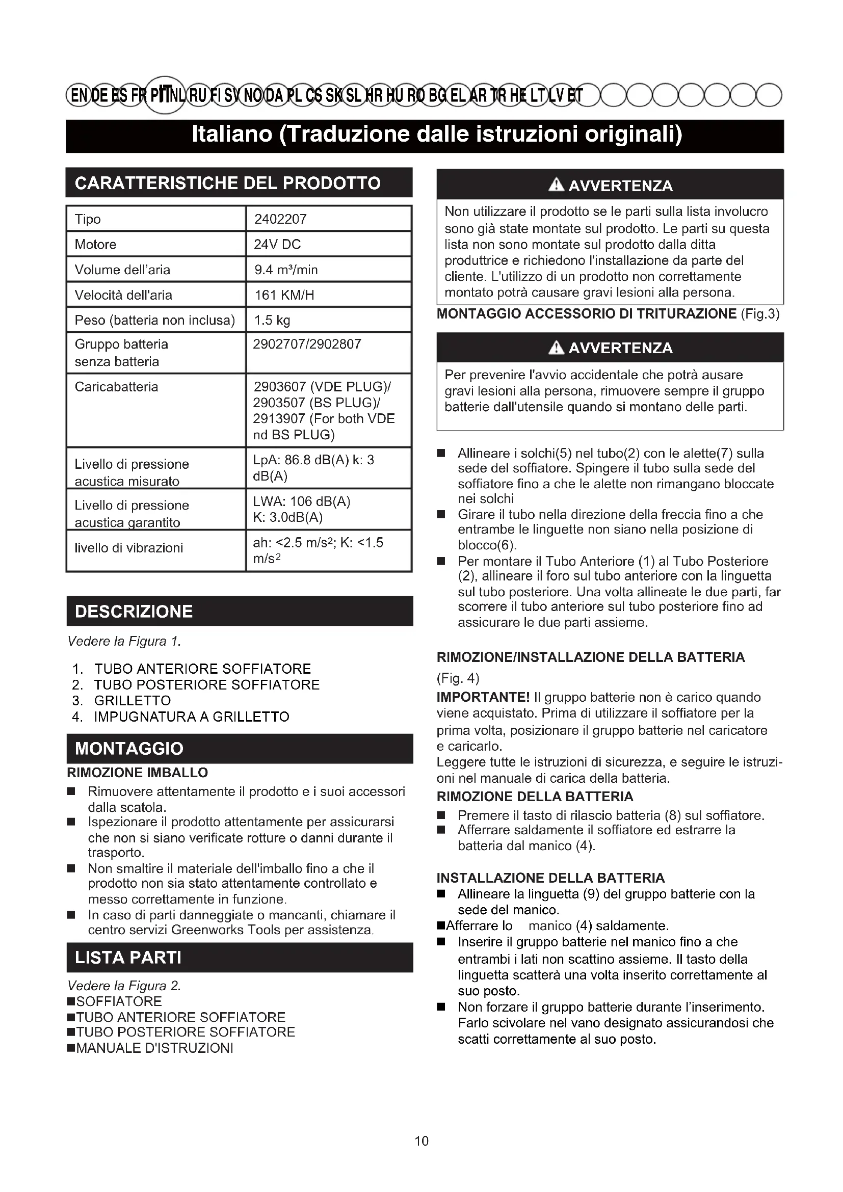 MONTAGGIO RIMOZIONE IMBALLO Rimuovere attentamente il prodotto e i suoi accessori dalla scatola. Ispezionare il prodotto attentamente per assicurarsi che non si siano verificate rotture o danni durante il trasporto. Non smaltire il materiale dell'imballo fino a che il prodotto non sia stato attentamente controllato e messo correttamente in funzione. In caso di parti danneggiate o mancanti, chiamare il centro servizi Greenworks Tools per assistenza. LISTA PARTI Vedere la Figura 2. SOFFIATORE TUBO ANTERIORE SOFFIATORE TUBO POSTERIORE SOFFIATORE MANUALE D'ISTRUZIONI AVVERTENZA Non utilizzare il prodotto se le parti sulla lista involucrosono già state montate sul prodotto. Le parti su questalista non sono montate sul prodotto dalla dittaproduttrice e richiedono l'installazione da parte delcliente. L'utilizzo di un prodotto non correttamentemontato potrà causare gravi lesioni alla persona.MONTAGGIO ACCESSORIO DI TRITURAZIONE (Fig.3) AVVERTENZA Per prevenire l'avvio accidentale che potrà ausaregravi lesioni alla persona, rimuovere sempre il gruppobatterie dall'utensile quando si montano delle parti. Allineare i solchi(5) nel tubo(2) con le alette(7) sulla sede del soffiatore. Spingere il tubo sulla sede del soffiatore fino a che le alette non rimangano bloccate nei solchi Girare il tubo nella direzione della freccia fino a che entrambe le linguette non siano nella posizione di blocco(6). Per montare il Tubo Anteriore (1) al Tubo Posteriore (2), allineare il foro sul tubo anteriore con la linguetta sul tubo posteriore. Una volta allineate le due parti, far scorrere il tubo anteriore sul tubo posteriore fino ad assicurare le due parti assieme.RIMOZIONE/INSTALLAZIONE DELLA BATTERIA (Fig. 4)IMPORTANTE! Il gruppo batterie non è carico quando #]YXXprima volta, posizionare il gruppo batterie nel caricatore e caricarlo.Leggere tutte le istruzioni di sicurezza, e seguire le istruzi-oni nel manuale di carica della batteria. RIMOZIONE DELLA BATTERIA Premere il tasto di rilascio batteria (8) sul soffiatore. Afferrare saldamente il soffiatore ed estrarre la batteria dal manico (4).INSTALLAZIONE DELLA BATTERIA Allineare la linguetta (9) del gruppo batterie con la sede del manico. Afferrare lo manico (4) saldamente. entrambi i lati non scattino assieme. Il tasto della linguetta scatterà una volta inserito correttamente al suo posto. Non forzare il gruppo batterie durante l’inserimento. Farlo scivolare nel vano designato assicurandosi che scatti correttamente al suo posto. 10Italiano (Traduzione dalle istruzioni originali)