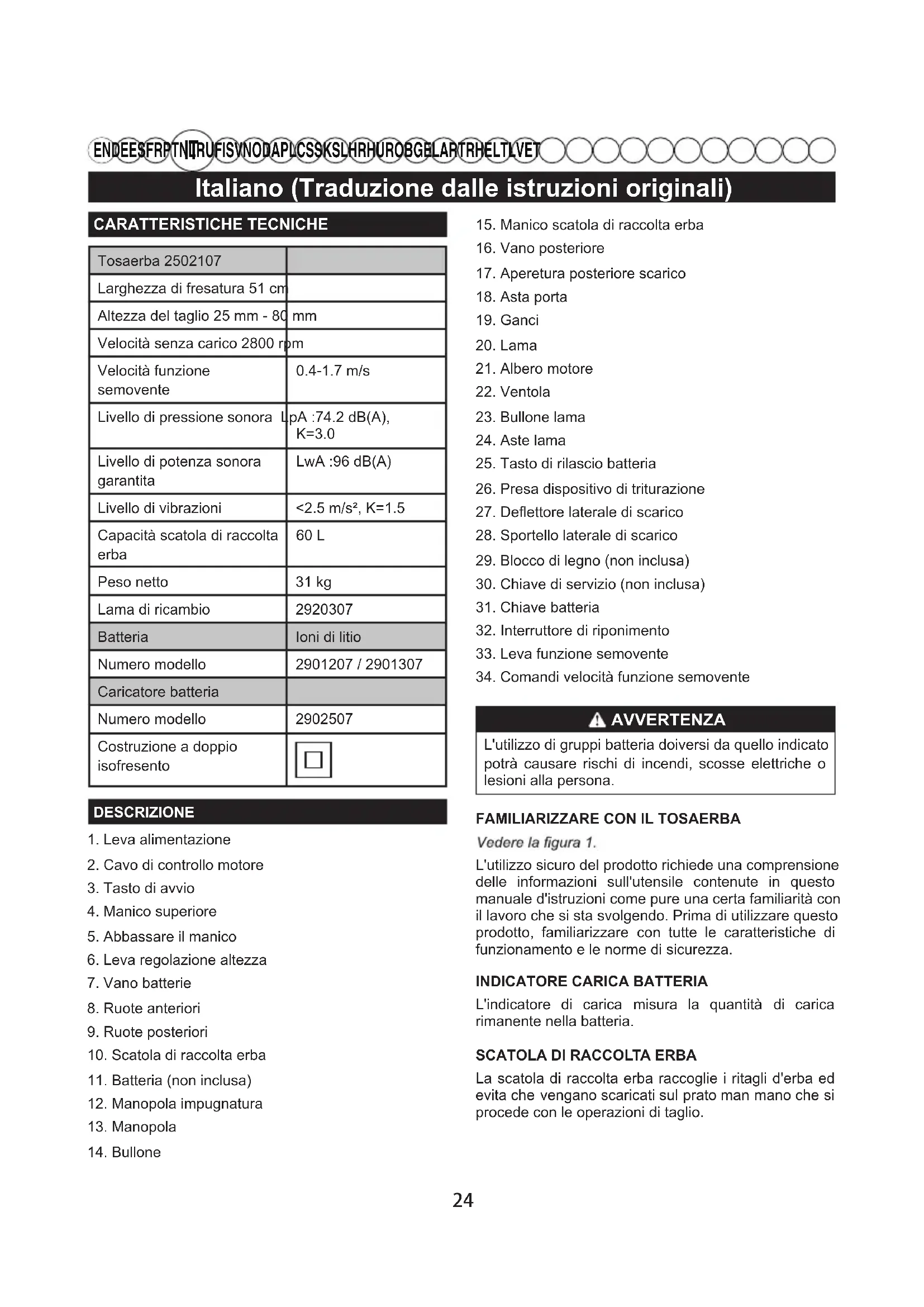 EN DE ES FR PT NL RU FI SV NO DA PL CS SK SL HR HU RO BG EL AR TR HE LT LV ET CARATTERISTICHE TECNICHETosaerba 2502107Larghezza di fresatura 51 cmAltezza del taglio 25 mm - 80 mmVelocità senza carico 2800 rpmVelocità funzione semovente0.4-1.7 m/sLivello di pressione sonora LpA :74.2 dB(A), K=3.0Livello di potenza sonora garantitaLwA :96 dB(A)Livello di vibrazioni <2.5 m/s², K=1.5Capacità scatola di raccolta erba 60 L Peso netto 31 kgLama di ricambio 2920307Batteria Ioni di litioNumero modello 2901207 / 2901307Caricatore batteriaNumero modello 2902507Costruzione a doppio isofresentoDESCRIZIONE1. Leva alimentazione2. Cavo di controllo motore3. Tasto di avvio 4. Manico superiore5. Abbassare il manico6. Leva regolazione altezza7. Vano batterie8. Ruote anteriori9. Ruote posteriori10. Scatola di raccolta erba11. Batteria (non inclusa)12. Manopola impugnatura13. Manopola14. Bullone15. Manico scatola di raccolta erba16. Vano posteriore17. Aperetura posteriore scarico18. Asta porta19. Ganci20. Lama21. Albero motore22. Ventola23. Bullone lama24. Aste lama25. Tasto di rilascio batteria26. Presa dispositivo di triturazione27. Deflettore laterale di scarico28. Sportello laterale di scarico29. Blocco di legno (non inclusa)30. Chiave di servizio (non inclusa)31. Chiave batteria32. Interruttore di riponimento33. Leva funzione semovente 34. Comandi velocità funzione semovente AVVERTENZA L'utilizzo di gruppi batteria doiversi da quello indicato potrà causare rischi di incendi, scosse elettriche o lesioni alla persona. FAMILIARIZZARE CON IL TOSAERBAL'utilizzo sicuro del prodotto richiede una comprensione delle informazioni sull'utensile contenute in questo manuale d'istruzioni come pure una certa familiarità con il lavoro che si sta svolgendo. Prima di utilizzare questo prodotto, familiarizzare con tutte le caratteristiche di funzionamento e le norme di sicurezza.INDICATORE CARICA BATTERIA L'indicatore di carica misura la quantità di carica rimanente nella batteria.SCATOLA DI RACCOLTA ERBA La scatola di raccolta erba raccoglie i ritagli d'erba ed evita che vengano scaricati sul prato man mano che si procede con le operazioni di taglio. 24Italiano (Traduzione dalle istruzioni originali)