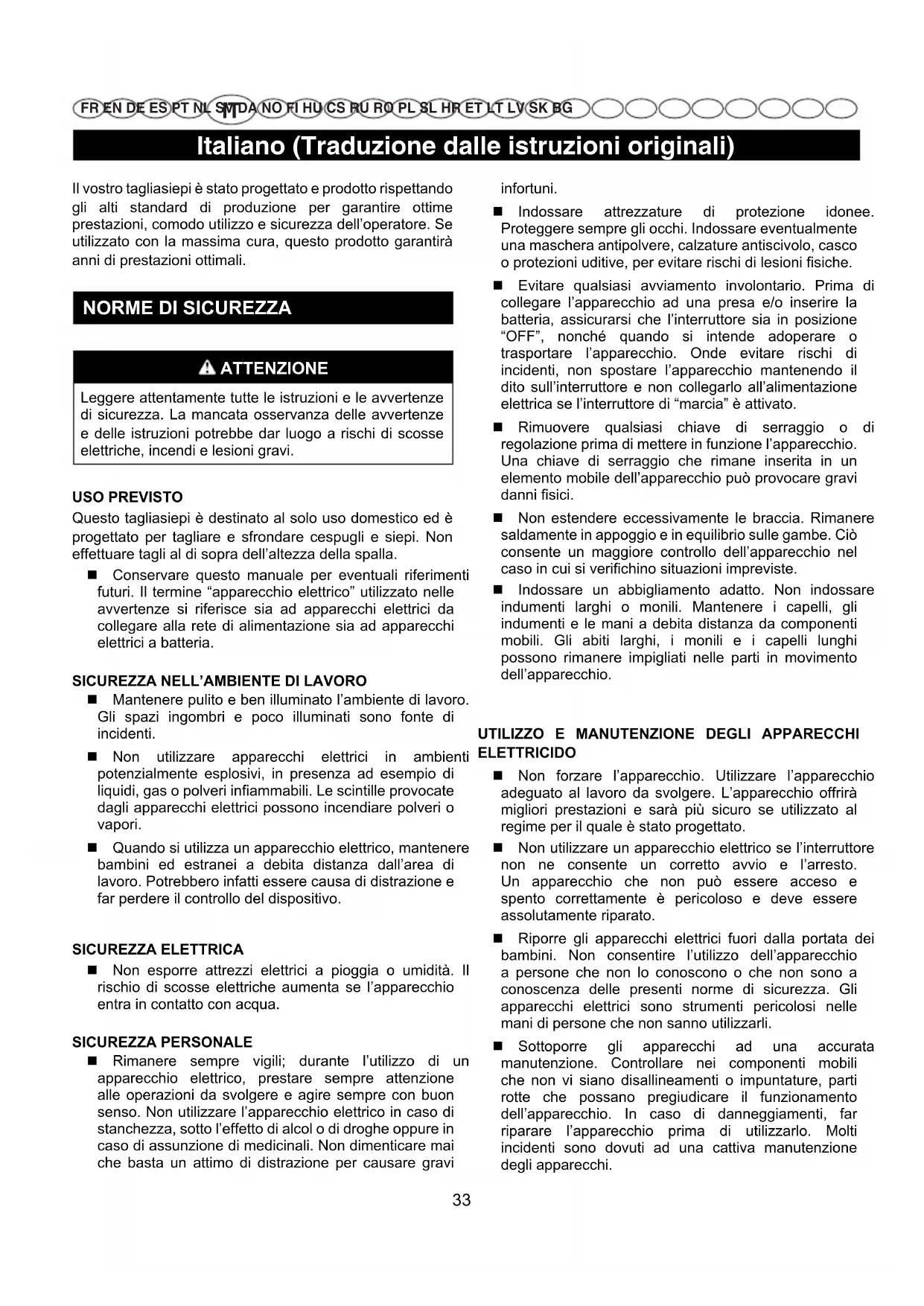 FR EN DE ES PT NL SV DA NO FI HU CS RU RO PL SL HR ET LT LV SK BG Il vostro tagliasiepi è stato progettato e prodotto rispettando gli alti standard di produzione per garantire ottime prestazioni, comodo utilizzo e sicurezza dell’operatore. Se utilizzato con la massima cura, questo prodotto garantirà anni di prestazioni ottimali.