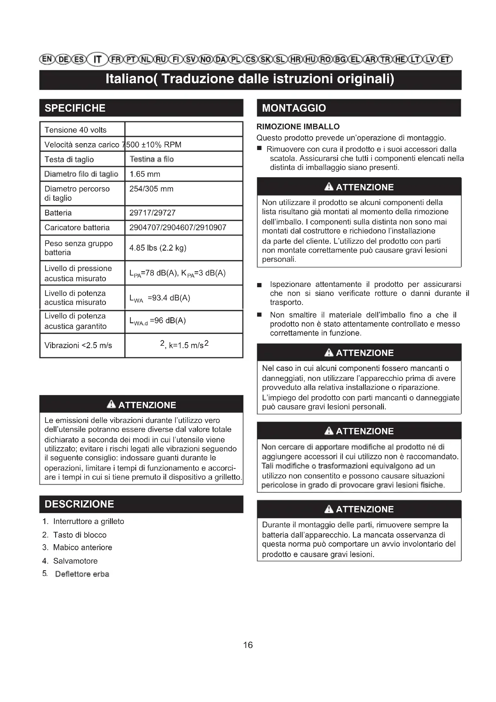 MONTAGGIO RIMOZIONE IMBALLO Questo prodotto prevede un’operazione di montaggio. Rimuovere con cura il prodotto e i suoi accessori dalla scatola. Assicurarsi che tutti i componenti elencati nella distinta di imballaggio siano presenti. ATTENZIONE Non utilizzare il prodotto se alcuni componenti della lista risultano già montati al momento della rimozione dell’imballo. I componenti sulla distinta non sono mai montati dal costruttore e richiedono l’installazione da parte del cliente. L’utilizzo del prodotto con parti non montate correttamente può causare gravi lesioni personali. Ispezionare attentamente il prodotto per assicurarsi che non si siano verificate rotture o danni durante il trasporto. Non smaltire il materiale dell’imballo fino a che il prodotto non è stato attentamente controllato e messo correttamente in funzione. ATTENZIONE Nel caso in cui alcuni componenti fossero mancanti o danneggiati, non utilizzare l’apparecchio prima di avere provveduto alla relativa installazione o riparazione. L’impiego del prodotto con parti mancanti o danneggiate può causare gravi lesioni personali. ATTENZIONE aggiungere accessori il cui utilizzo non è raccomandato. utilizzo non consentito e possono causare situazioni ATTENZIONE Durante il montaggio delle parti, rimuovere sempre la batteria dall’apparecchio. La mancata osservanza di questa norma può comportare un avvio involontario del prodotto e causare gravi lesioni.
