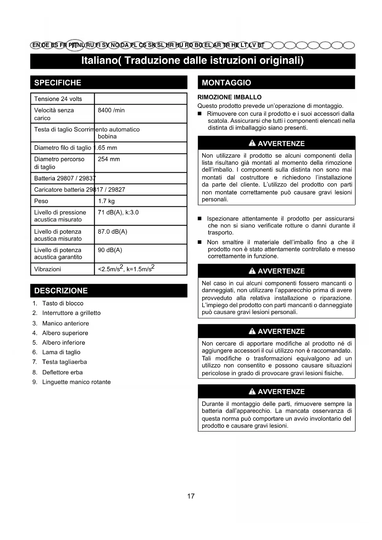 EN DE ES FR PT NL RU FI SV NO DA PL CS SK SL HR HU RO BG EL AR TR HE LT LV ET SPECIFICHE Tensione 24 volts Velocità senza carico 8400 /min Testa di taglio Scorrimento automatico bobina Diametro lo di taglio 1.65 mm Diametro percorso di taglio 254 mm Batteria 29807 / 29837 Caricatore batteria 29817 / 29827 Peso 1.7 kg Livello di pressione acustica misurato 71 dB(A), k:3.0 Livello di potenza acustica misurato