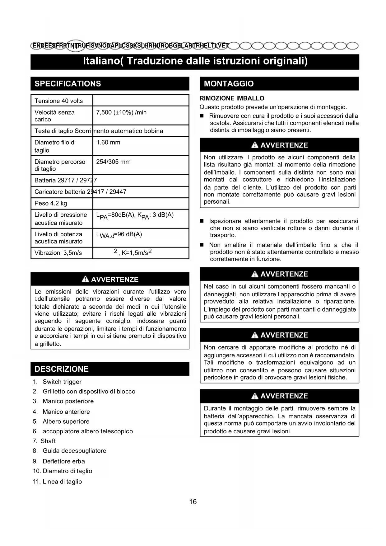 MONTAGGIO RIMOZIONE IMBALLO Questo prodotto prevede un’operazione di montaggio. Rimuovere con cura il prodotto e i suoi accessori dalla scatola. Assicurarsi che tutti i componenti elencati nella distinta di imballaggio siano presenti. AVVERTENZE Non utilizzare il prodotto se alcuni componenti della lista risultano già montati al momento della rimozione dell’imballo. I componenti sulla distinta non sono mai montati dal costruttore e richiedono l’installazione da parte del cliente. L’utilizzo del prodotto con parti non montate correttamente può causare gravi lesioni personali. Ispezionare attentamente il prodotto per assicurarsi che non si siano verificate rotture o danni durante il trasporto. Non smaltire il materiale dell’imballo fino a che il prodotto non è stato attentamente controllato e messo correttamente in funzione. AVVERTENZE Nel caso in cui alcuni componenti fossero mancanti o danneggiati, non utilizzare l’apparecchio prima di avere provveduto alla relativa installazione o riparazione. L’impiego del prodotto con parti mancanti o danneggiate può causare gravi lesioni personali. AVVERTENZE Non cercare di apportare modiche al prodotto né di aggiungere accessori il cui utilizzo non è raccomandato. Tali modiche o trasformazioni equivalgono ad un utilizzo non consentito e possono causare situazioni pericolose in grado di provocare gravi lesioni siche. AVVERTENZE Durante il montaggio delle parti, rimuovere sempre la batteria dall’apparecchio. La mancata osservanza di questa norma può comportare un avvio involontario del prodotto e causare gravi lesioni. 16Italiano( Traduzione dalle istruzioni originali)