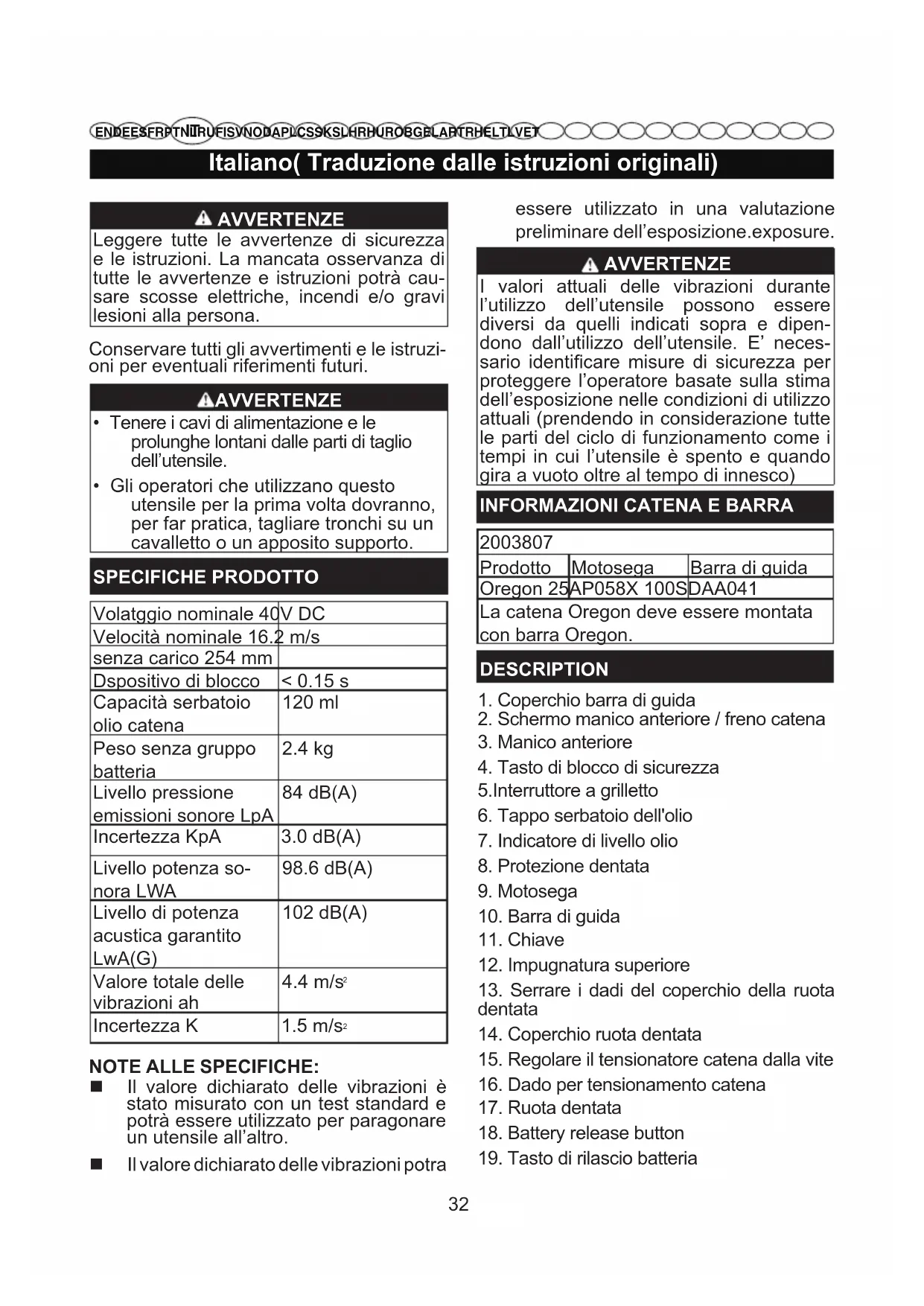 CATENA Vedere la Figura 2-7. Assicurarsi di rimuovere il gruppo batterie dall'unità. Indossare guanti protettivi. Svitare i dadi di blocco del coperchio della ruota dentata per rimuovere il coperchio della ruota dentata. I denti taglienti devono essere rivolti in direzione della rotazione della catena. Se sono rivolti in direzione opposta, rovesciare il cerchio. Posizionare gli elementi della catena nella scanalatura. Posizionare la catena in modo da formare un cerchio sulla parte posteriore della barra. Tenere la catena in posizione sulla barra e avvolgere il cerchio attorno alla ruota dentata assicurandosi che sia montato correttamente. Assicurarsi che il foro della barra si inserisca perfetamente sul bullone per un perfetto tensionamento della catena. Riposizionare il coperchio della ruota dentata, girare in senso orario il bullone di regolazione del tensionatore catena no a che la catena non sia correttamente tensionata. La barra di guida dovrà quindi essere spinta verso l’alto, controllare di nuovo la tensione della catena, non tensionare troppo la catena. Dopo aver tensionato correttamente la catena, serrare di nuovo i dadi. NOTE: La catena sarà correttamente tensionata se, nel centro della lama, potrà essere sollevata di 3-4mm dal bordo della lama. Avviando di nuovo la motosega con una nuova catena, lasciarla ruotare per 2-3 minuti. AVVERTENZE Dopo aver fatto girare la catena per la prima volta, controllare la tensone e as- sicurare di nuovo la catena se necessario. FUNZIONAMENTO Per istruzioni riguardanti il caricamento, far riferimento al Manuale d'istruzioni per il gruppo batterie e i modelli di caricatore. NOTE: Per evitare gravi lesioni personali, rimuovere sempre il gruppo batterie e tenere le mani lontane dal tasto di blocco quando si trasporta o sposta l’utensile.Italiano( Traduzione dalle istruzioni originali)
