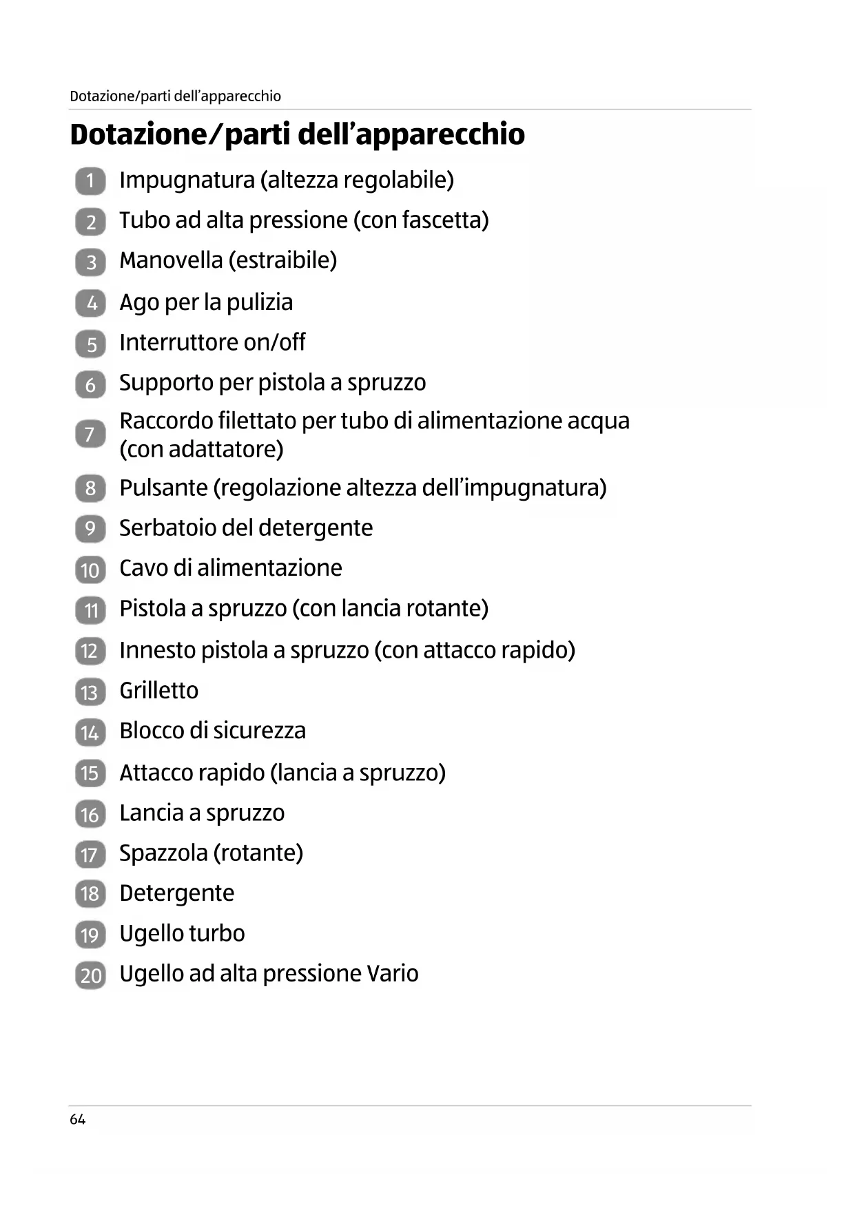 Dotazione/parti dell'apparecchio....64
