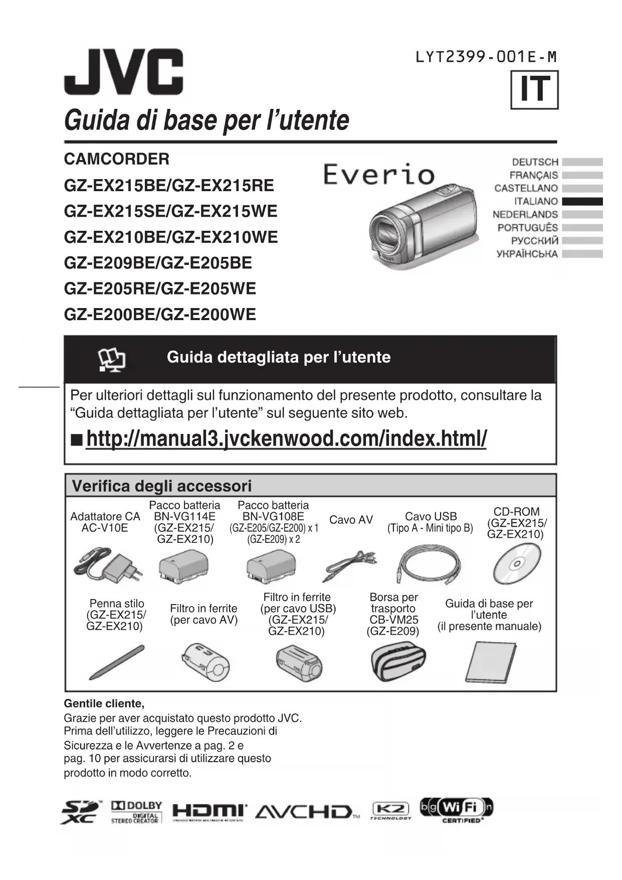Scarica le istruzioni per il tuo Videocamera in formato PDF gratuitamente! Trova il tuo manuale Everio GZE200WE - JVC e riprendi in mano il tuo dispositivo elettronico. In questa pagina sono pubblicati tutti i documenti necessari per l'utilizzo del tuo dispositivo. Everio GZE200WE del marchio JVC.