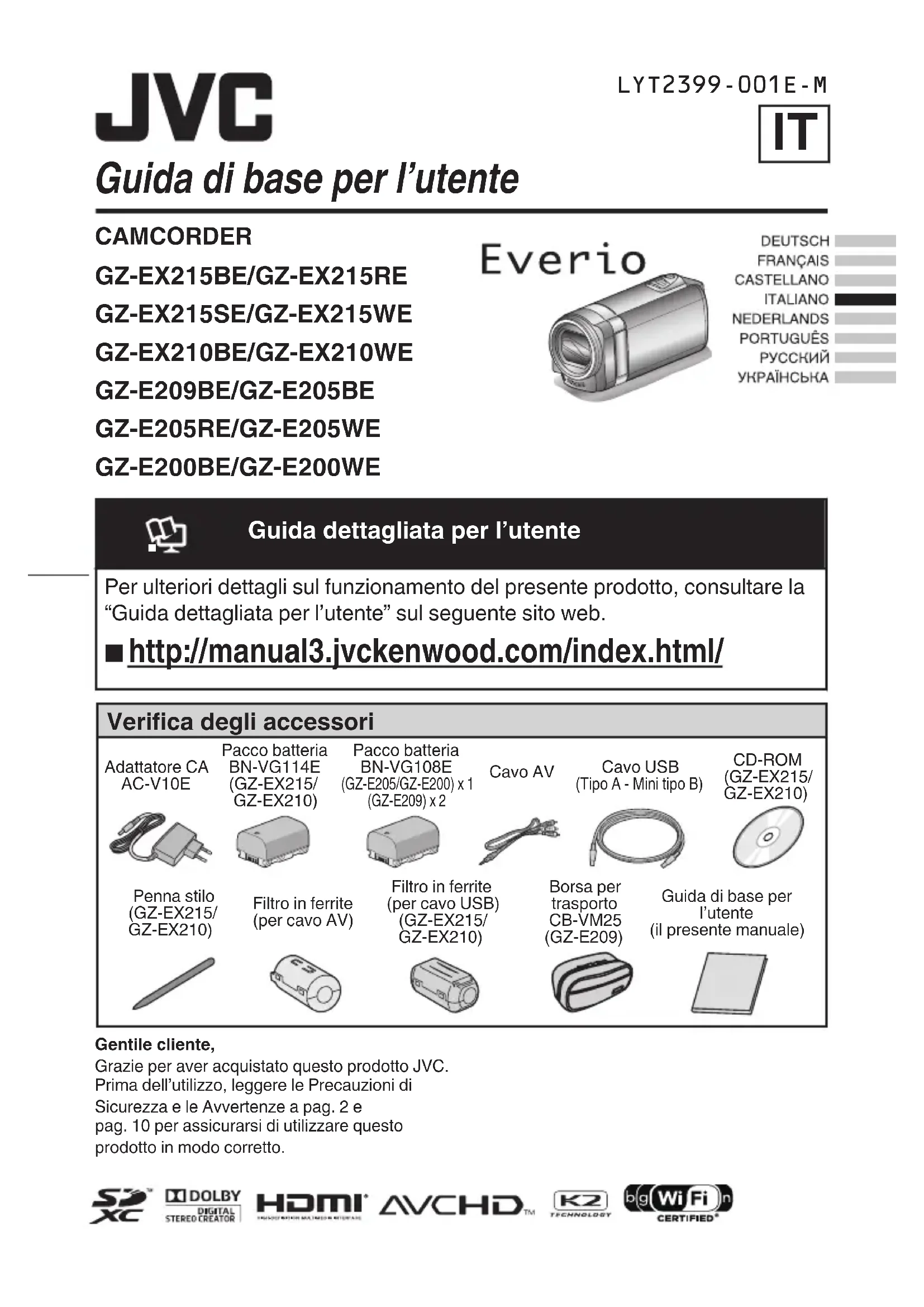 Scarica le istruzioni per il tuo Videocamera in formato PDF gratuitamente! Trova il tuo manuale Everio GZE209BE - JVC e riprendi in mano il tuo dispositivo elettronico. In questa pagina sono pubblicati tutti i documenti necessari per l'utilizzo del tuo dispositivo. Everio GZE209BE del marchio JVC.