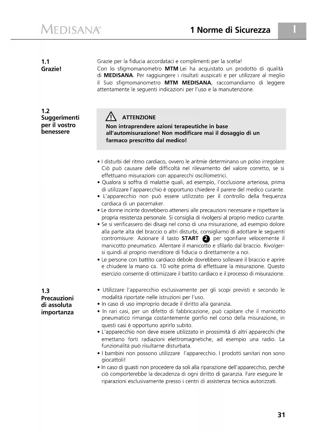 Con lo sfigmomanometro MTM Lei ha acquistato un prodotto di qualità di MEDISANA. Per raggiungere i risultati auspicati e per utilizzare al meglio il Suo sfigmomanometro MTM MEDISANA, raccomandiamo di leggere attentamente le seguenti indicazioni per l'uso e la manutenzione.
