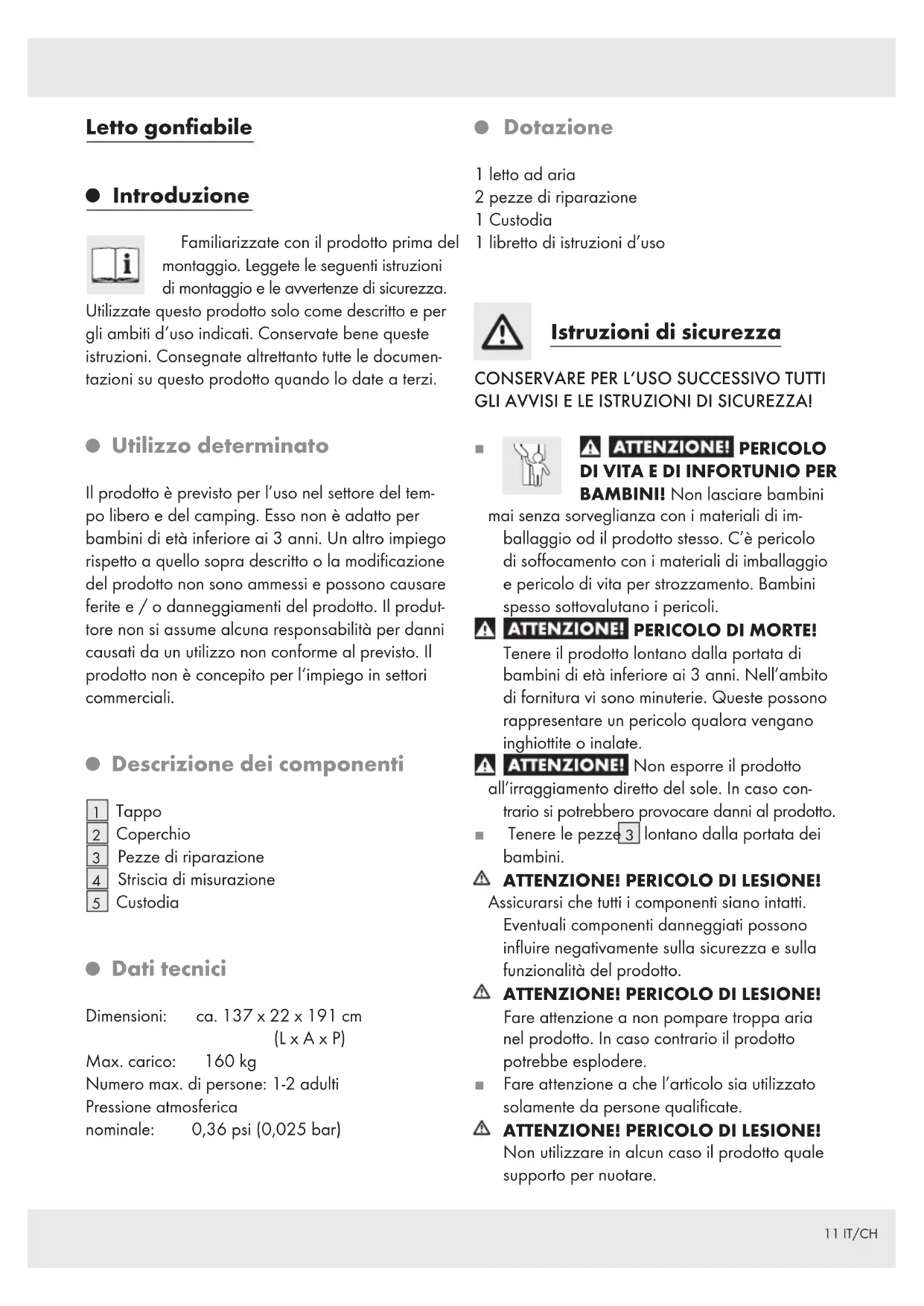 Numero max. di persone: 1-2 adulti Pressione atmosferica