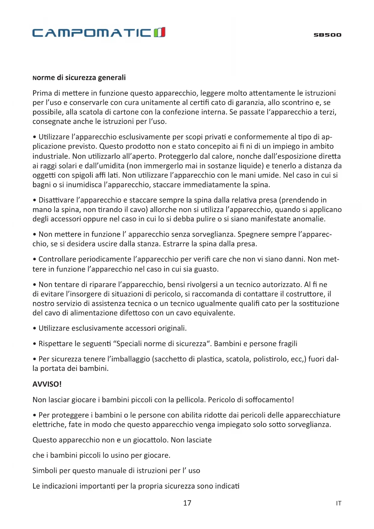 Trova gratuitamente il manuale del dispositivo SB500 Campomatic in formato PDF.
