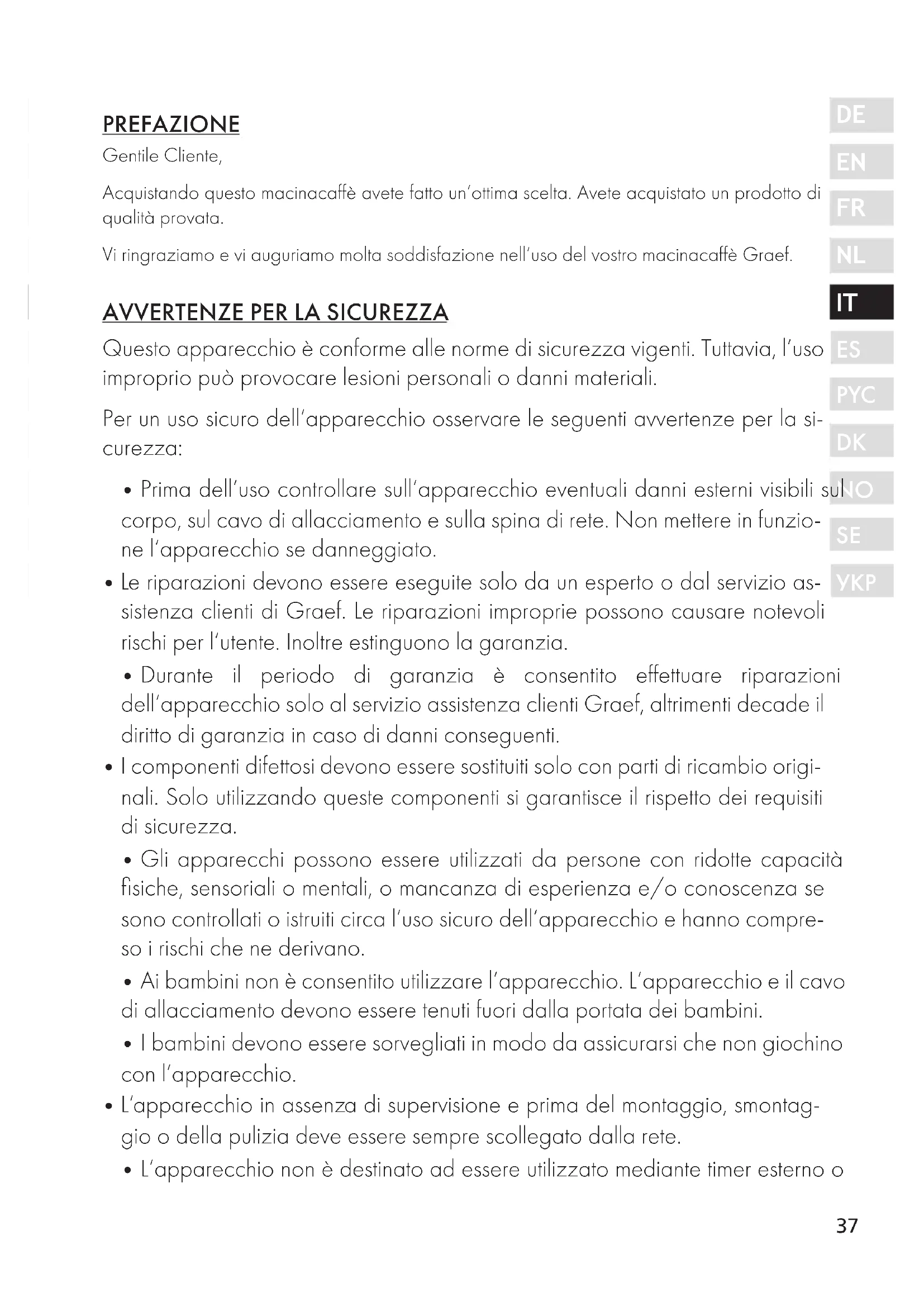 PREFAZIONE Gentile Cliente, Acquistando questo macinacaffè avete fatto un‘ottima scelta. Avete acquistato un prodotto di qualità provata. Vi ringraziamo e vi auguriamo molta soddisfazione nell‘uso del vostro macinacaffè Graef.