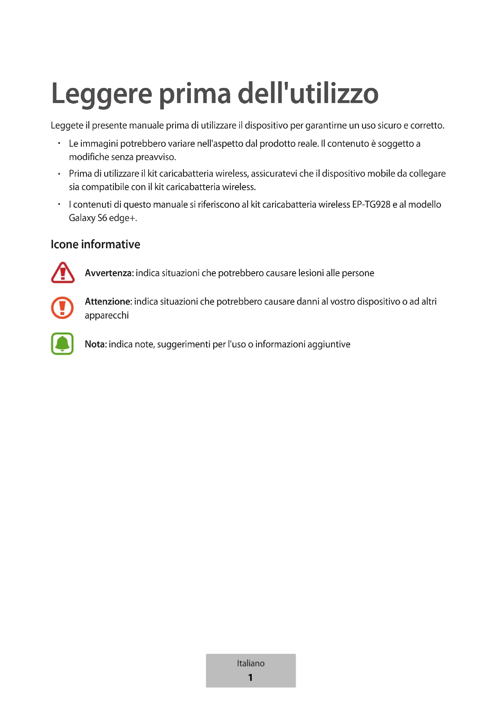 I contenuti di questo manuale si riferiscono al kit caricabatteria wireless EP-TG928 e al modello Galaxy S6 edge+. Icone informative Avvertenza: indica situazioni che potrebbero causare lesioni alle persone Attenzione: indica situazioni che potrebbero causare danni al vostro dispositivo o ad altri apparecchi Nota: indica note, suggerimenti per l'uso o informazioni aggiuntive Italiano