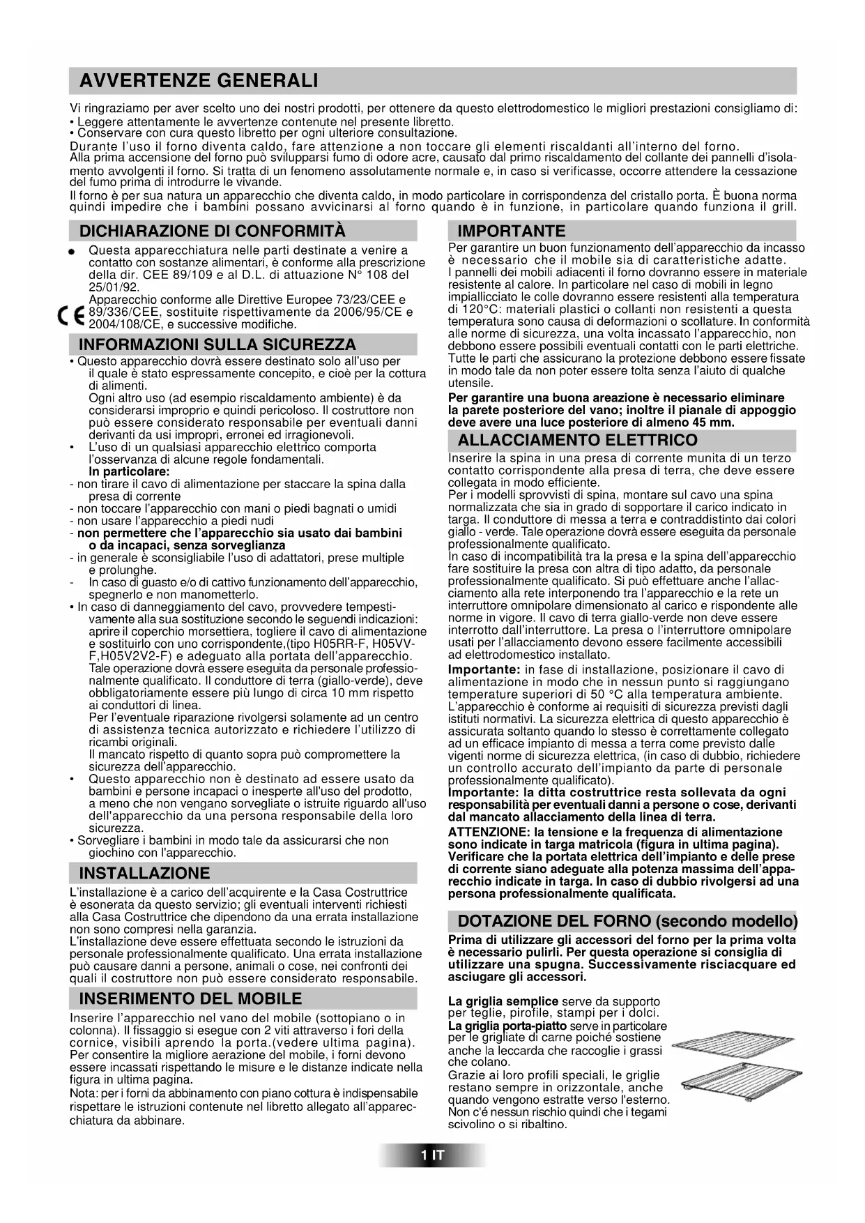 Inserire l’apparecchio nel vano del mobile (sottopiano o in colonna). Il fissaggio si esegue con 2 viti attraverso i fori della cornice, visibili aprendo la porta.(vedere ultima pagina). Per consentire la migliore aerazione del mobile, i forni devono essere incassati rispettando le misure e le distanze indicate nella figura in ultima pagina. Nota: per i forni da abbinamento con piano cottura è indispensabile rispettare le istruzioni contenute nel libretto allegato all’apparec- chiatura da abbinare. IMPORTANTE Per garantire un buon funzionamento dell’apparecchio da incasso è necessario che il mobile sia di caratteristiche adatte. I pannelli dei mobili adiacenti il forno dovranno essere in materiale resistente al calore. In particolare nel caso di mobili in legno impiallicciato le colle dovranno essere resistenti alla temperatura di 120°C: materiali plastici o collanti non resistenti a questa temperatura sono causa di deformazioni o scollature. In conformità alle norme di sicurezza, una volta incassato l’apparecchio, non debbono essere possibili eventuali contatti con le parti elettriche. Tutte le parti che assicurano la protezione debbono essere fissate in modo tale da non poter essere tolta senza l’aiuto di qualche utensile. Per garantire una buona areazione è necessario eliminare la parete posteriore del vano; inoltre il pianale di appoggio deve avere una luce posteriore di almeno 45 mm. ALLACCIAMENTO ELETTRICO Inserire la spina in una presa di corrente munita di un terzo contatto corrispondente alla presa di terra, che deve essere collegata in modo efficiente. Per i modelli sprovvisti di spina, montare sul cavo una spina normalizzata che sia in grado di sopportare il carico indicato in targa. Il conduttore di messa a terra e contraddistinto dai colori giallo - verde. Tale operazione dovrà essere eseguita da personale professionalmente qualificato. In caso di incompatibilità tra la presa e la spina dell’apparecchio fare sostituire la presa con altra di tipo adatto, da personale professionalmente qualificato. Si può effettuare anche l’allac- ciamento alla rete interponendo tra l’apparecchio e la rete un interruttore omnipolare dimensionato al carico e rispondente alle norme in vigore. Il cavo di terra giallo-verde non deve essere interrotto dall’interruttore. La presa o l’interruttore omnipolare usati per l’allacciamento devono essere facilmente accessibili ad elettrodomestico installato. Importante: in fase di installazione, posizionare il cavo di alimentazione in modo che in nessun punto si raggiungano temperature superiori di 50 °C alla temperatura ambiente. L’apparecchio è conforme ai requisiti di sicurezza previsti dagli istituti normativi. La sicurezza elettrica di questo apparecchio è assicurata soltanto quando lo stesso è correttamente collegato ad un efficace impianto di messa a terra come previsto dalle vigenti norme di sicurezza elettrica, (in caso di dubbio, richiedere un controllo accurato dell’impianto da parte di personale professionalmente qualificato). Importante: la ditta costruttrice resta sollevata da ogni responsabilità per eventuali danni a persone o cose, derivanti dal mancato allacciamento della linea di terra. ATTENZIONE: la tensione e la frequenza di alimentazione sono indicate in targa matricola (figura in ultima pagina). Verificare che la portata elettrica dell’impianto e delle prese di corrente siano adeguate alla potenza massima dell’appa- recchio indicate in targa. In caso di dubbio rivolgersi ad una persona professionalmente qualificata. La griglia semplice serve da supporto per teglie, pirofile, stampi per i dolci. La griglia porta-piatto serve in particolare per le grigliate di carne poiché sostiene anche la leccarda che raccoglie i grassi che colano. Grazie ai loro profili speciali, le griglie restano sempre in orizzontale, anche quando vengono estratte verso l'esterno. Non c'é nessun rischio quindi che i tegami scivolino o si ribaltino. DOTAZIONE DEL FORNO (secondo modello) Prima di utilizzare gli accessori del forno per la prima volta è necessario pulirli. Per questa operazione si consiglia di utilizzare una spugna. Successivamente risciacquare ed asciugare gli accessori.2 IT CONSIGLI UTILI