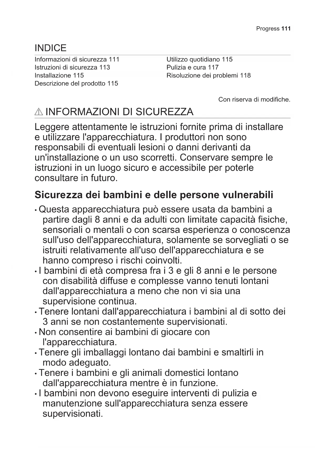 - I bambini non devono eseguire interventi di pulizia e manutenzione sull'apparecchiatura senza essere supervisionati. Progress 111Avvertenze di sicurezza generali