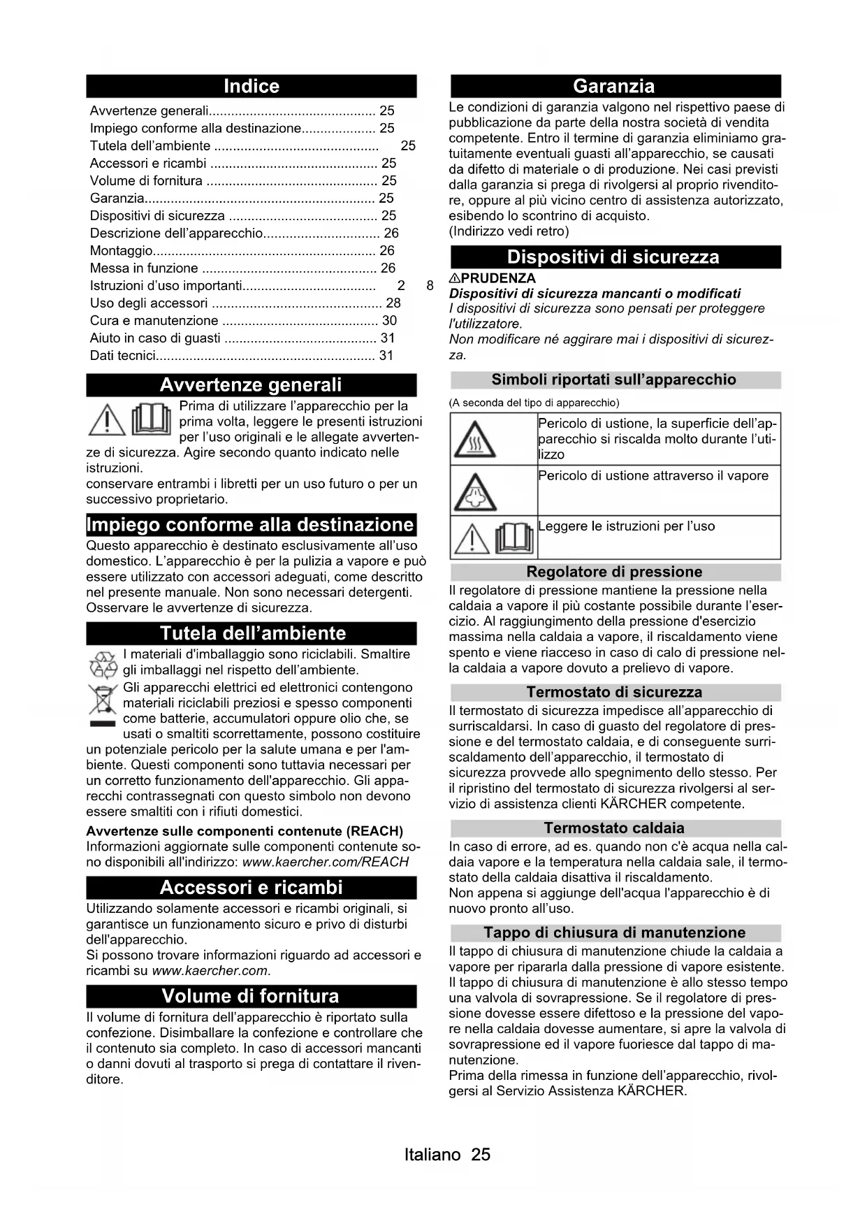 - jusqu'à ce qu'il s'enclenche. Impossible d'appuyer sur la manette vapeur La manette vapeur est protégée par la sécurité enfants. Pousser la sécurité enfants (sélecteur de débit de vapeur) vers l'avant. La manette vapeur est déverrouillée. Longue durée de chauffage La chaudière à vapeur est entartrée. Détartrer la chaudière à vapeur. Prélèvement d’eau élevé La chaudière à vapeur est entartrée. Détartrer la chaudière à vapeur. Le fer à repasser vapeur « crache » de l'eau Rincer la chaudière à vapeur du nettoyeur vapeur ou la détartrer, voir chapitreDétartrage de la chau- dière à vapeur. Après les pauses, des gouttes d'eau s'échappent du fer à repasser vapeur Après des pauses prolongées, de la vapeur peut condenser dans la conduite de vapeur. Après les pauses, diriger le pic de vapeur sur un chiffon jusqu'à ce que la vapeur s'échappe réguliè- rement. Caractéristiques techniques Sous réserve de modifications techniques. Raccordement électrique Tension V 220-240 Phase ~ 1 Fréquence Hz 50-60 Type de protection IPX4 Classe de protection I Caractéristiques de puissance Puissance de chauffe W 2000 Puissance de chauffe, fer à repas- ser W700 Pression de service maximale MPa 0,35 Durée de chauffage Minutes 4 Vaporisation permanente g/min 50 Pic de vapeur maximal g/min 110 Volume de remplissage Réservoir d'eau l 0,8 Chaudière à vapeur l 0,5 Dimensions et poids Poids (sans accessoires) kg 4,1 Longueur mm 350 Largeur mm 280 Hauteur mm 270Italiano 25 Indice Avvertenze generali Prima di utilizzare l’apparecchio per la prima volta, leggere le presenti istruzioni per l’uso originali e le allegate avverten- ze di sicurezza. Agire secondo quanto indicato nelle istruzioni. conservare entrambi i libretti per un uso futuro o per un successivo proprietario. Impiego conforme alla destinazione Questo apparecchio è destinato esclusivamente all’uso domestico. L’apparecchio è per la pulizia a vapore e può essere utilizzato con accessori adeguati, come descritto nel presente manuale. Non sono necessari detergenti. Osservare le avvertenze di sicurezza. Tutela dell’ambiente I materiali d'imballaggio sono riciclabili. Smaltire gli imballaggi nel rispetto dell’ambiente. Gli apparecchi elettrici ed elettronici contengono materiali riciclabili preziosi e spesso componenti come batterie, accumulatori oppure olio che, se usati o smaltiti scorrettamente, possono costituire un potenziale pericolo per la salute umana e per l'am- biente. Questi componenti sono tuttavia necessari per un corretto funzionamento dell'apparecchio. Gli appa- recchi contrassegnati con questo simbolo non devono essere smaltiti con i rifiuti domestici. Avvertenze sulle componenti contenute (REACH) Informazioni aggiornate sulle componenti contenute so- no disponibili all'indirizzo: www.kaercher.com/REACH Accessori e ricambi Utilizzando solamente accessori e ricambi originali, si garantisce un funzionamento sicuro e privo di disturbi dell'apparecchio. Si possono trovare informazioni riguardo ad accessori e ricambi su www.kaercher.com. Volume di fornitura Il volume di fornitura dell’apparecchio è riportato sulla confezione. Disimballare la confezione e controllare che il contenuto sia completo. In caso di accessori mancanti o danni dovuti al trasporto si prega di contattare il riven- ditore. Garanzia Le condizioni di garanzia valgono nel rispettivo paese di pubblicazione da parte della nostra società di vendita competente. Entro il termine di garanzia eliminiamo gra- tuitamente eventuali guasti all’apparecchio, se causati da difetto di materiale o di produzione. Nei casi previsti dalla garanzia si prega di rivolgersi al proprio rivendito- re, oppure al più vicino centro di assistenza autorizzato, esibendo lo scontrino di acquisto. (Indirizzo vedi retro) Dispositivi di sicurezza 몇 PRUDENZA Dispositivi di sicurezza mancanti o modificati I dispositivi di sicurezza sono pensati per proteggere l'utilizzatore. Non modificare né aggirare mai i dispositivi di sicurez- za. Simboli riportati sull’apparecchio (A seconda del tipo di apparecchio) Regolatore di pressione Il regolatore di pressione mantiene la pressione nella caldaia a vapore il più costante possibile durante l’eser- cizio. Al raggiungimento della pressione d'esercizio massima nella caldaia a vapore, il riscaldamento viene spento e viene riacceso in caso di calo di pressione nel- la caldaia a vapore dovuto a prelievo di vapore. Termostato di sicurezza Il termostato di sicurezza impedisce all’apparecchio di surriscaldarsi. In caso di guasto del regolatore di pres- sione e del termostato caldaia, e di conseguente surri- scaldamento dell’apparecchio, il termostato di sicurezza provvede allo spegnimento dello stesso. Per il ripristino del termostato di sicurezza rivolgersi al ser- vizio di assistenza clienti KÄRCHER competente. Termostato caldaia In caso di errore, ad es. quando non c'è acqua nella cal- daia vapore e la temperatura nella caldaia sale, il termo- stato della caldaia disattiva il riscaldamento. Non appena si aggiunge dell'acqua l'apparecchio è di nuovo pronto all’uso. Tappo di chiusura di manutenzione Il tappo di chiusura di manutenzione chiude la caldaia a vapore per ripararla dalla pressione di vapore esistente. Il tappo di chiusura di manutenzione è allo stesso tempo una valvola di sovrapressione. Se il regolatore di pres- sione dovesse essere difettoso e la pressione del vapo- re nella caldaia dovesse aumentare, si apre la valvola di sovrapressione ed il vapore fuoriesce dal tappo di ma- nutenzione. Prima della rimessa in funzione dell’apparecchio, rivol- gersi al Servizio Assistenza KÄRCHER. Avvertenze generali p. 25