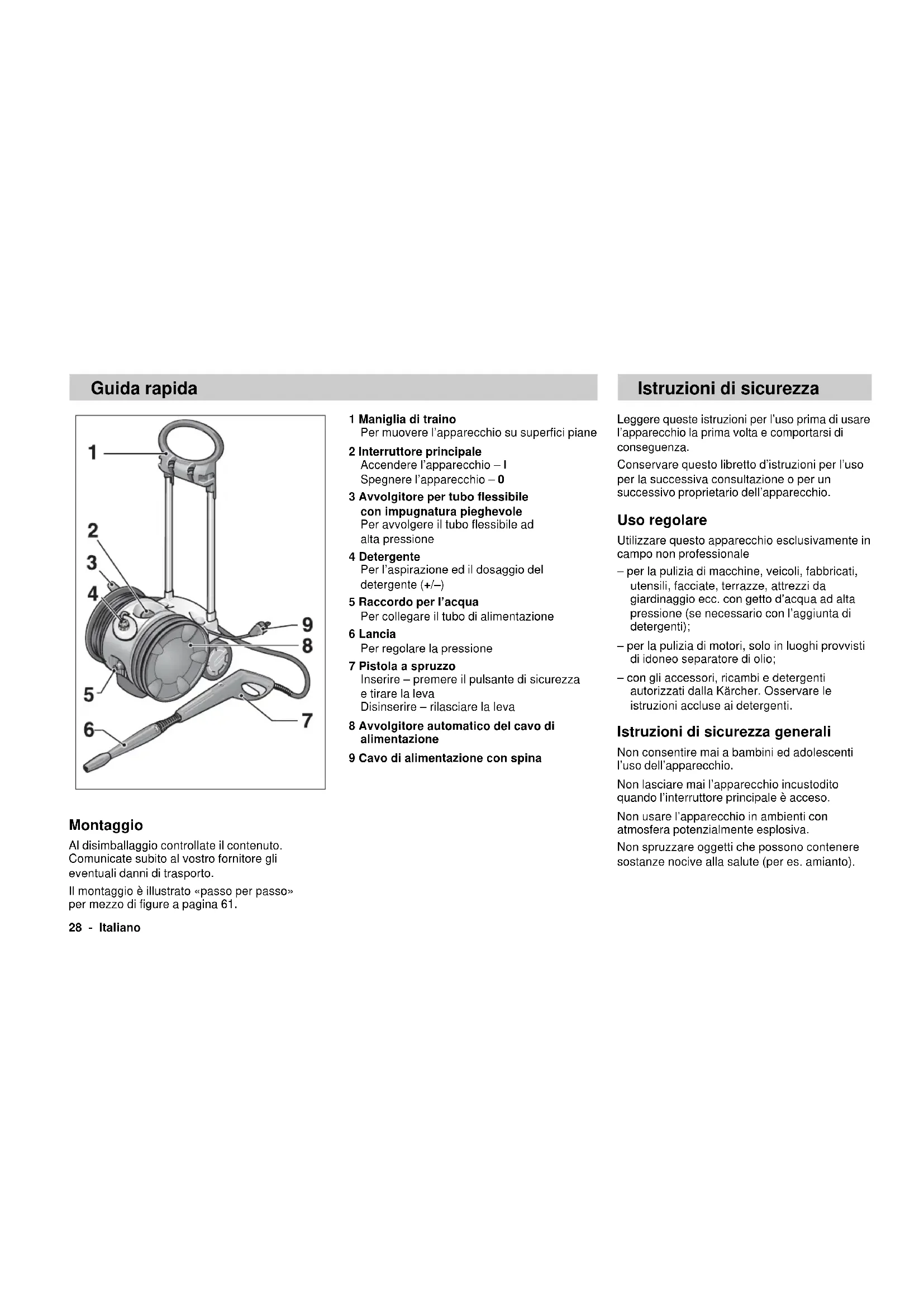Procédure appliquée pour l’évaluation de la conformité: Appendice V Niveau de puissance acoustique mesuré: 91 dB(A) garanti: 93 dB(A) La conformité permanente des appareils de série avec les exigences consignées dans les directives actuelles de la CE et avec les normes appliquées est garantie par des mesures internes.Les soussignés agissent par ordre et avec les pleins pouvoirs de la Direction commerciale. 5.957-566 (04/03) Alfred Kärcher GmbH & Co. KG Cleaning Systems Alfred-Kärcher-Str. 28–40 P.O. Box 160 D-71349 Winnenden H. JennerS. Reiser Schéma des circuits électriques C1Condensateur de service F1 Fusible thermique M1Moteur S1Commutateur de l’appareil S2 Pressostat28 - Italiano 1 Maniglia di traino Per muovere l’apparecchio su superfici piane 2 Interruttore principale Accendere l’apparecchio – I Spegnere l’apparecchio – 0 3 Avvolgitore per tubo flessibile con impugnatura pieghevole Per avvolgere il tubo flessibile ad alta pressione 4 Detergente Per l’aspirazione ed il dosaggio del detergente (+/–) 5 Raccordo per l’acqua Per collegare il tubo di alimentazione 6 Lancia Per regolare la pressione 7 Pistola a spruzzo Inserire – premere il pulsante di sicurezza e tirare la leva Disinserire – rilasciare la leva 8 Avvolgitore automatico del cavo di alimentazione 9 Cavo di alimentazione con spina Leggere queste istruzioni per l’uso prima di usare l’apparecchio la prima volta e comportarsi di conseguenza. Conservare questo libretto d’istruzioni per l’uso per la successiva consultazione o per un successivo proprietario dell’apparecchio. Uso regolare Utilizzare questo apparecchio esclusivamente in campo non professionale – per la pulizia di macchine, veicoli, fabbricati, utensili, facciate, terrazze, attrezzi da giardinaggio ecc. con getto d’acqua ad alta pressione (se necessario con l’aggiunta di detergenti); – per la pulizia di motori, solo in luoghi provvisti di idoneo separatore di olio; – con gli accessori, ricambi e detergenti autorizzati dalla Kärcher. Osservare le istruzioni accluse ai detergenti. Istruzioni di sicurezza generali Non consentire mai a bambini ed adolescenti l’uso dell’apparecchio. Non lasciare mai l’apparecchio incustodito quando l’interruttore principale è acceso. Non usare l’apparecchio in ambienti con atmosfera potenzialmente esplosiva. Non spruzzare oggetti che possono contenere sostanze nocive alla salute (per es. amianto). Guida rapida Montaggio Al disimballaggio controllate il contenuto. Comunicate subito al vostro fornitore gli eventuali danni di trasporto. Il montaggio è illustrato «passo per passo» per mezzo di figure a pagina 61. Istruzioni di sicurezzaItaliano - 29