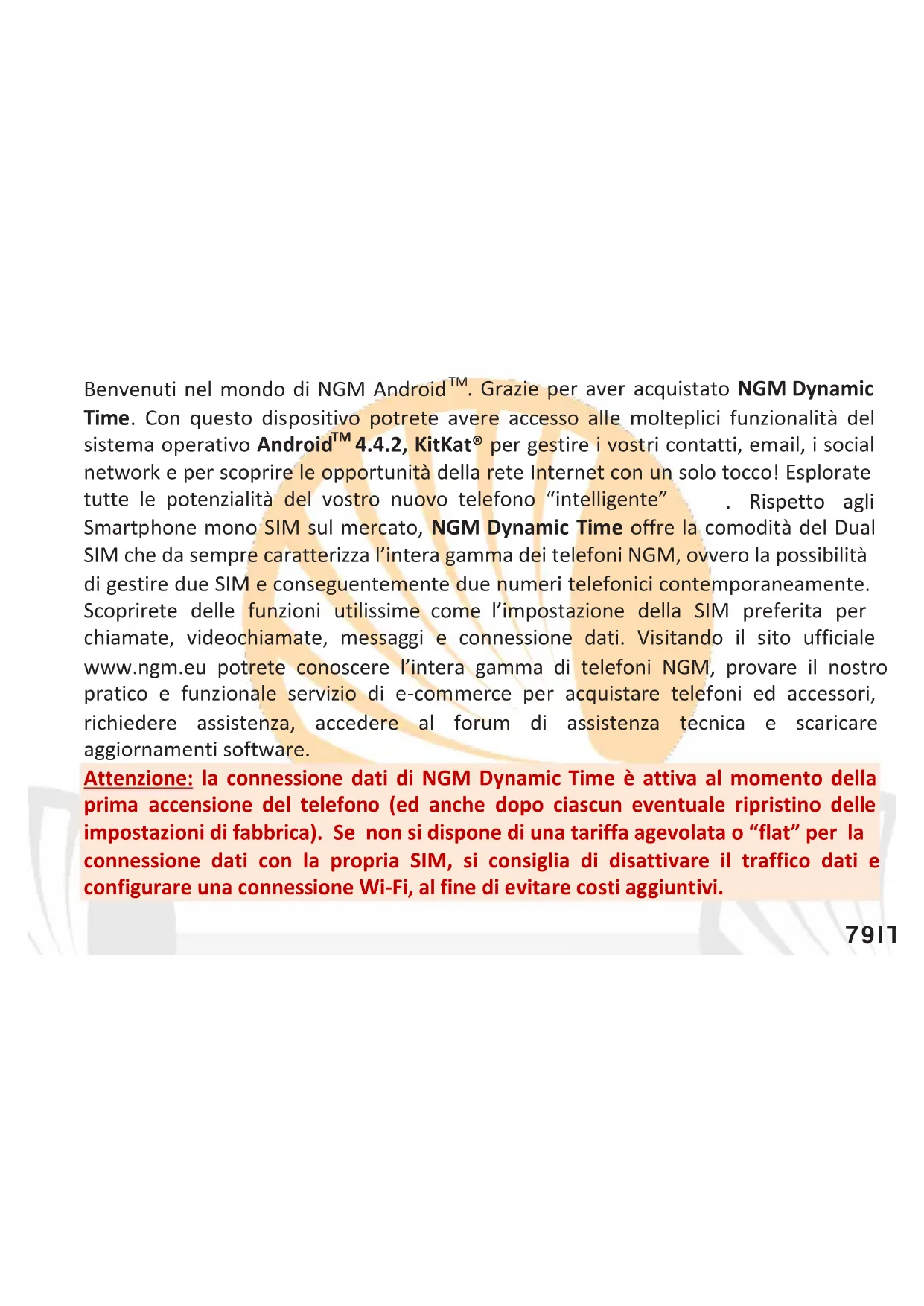 Dalla schermata principale, toccate l’icona Telefono; digitate il numero telefonico da chiamare usando la tastiera virtuale. Premete l’icona cornetta relativa alla SIM desiderata. Per terminare, toccate l’icona rossa di fine chiamata. Per rispondere ad una chiamata, trascinate la cornetta centrale verso destra sulla cornetta verde; per rifiutarla, trascinatela verso sinistra sulla cornetta rossa, per rifiutare tramite messaggio portate la cornetta verso l’alto. Per silenziare una chiamata in arrivo, toccate il tasto Volume “+” o “–“ (sul lato destro del telefono). Richiamare un numero dal registro chiamate Dal menu principale, entrate nel menu Telefono e selezionate l’icona ; viene visualizzato il registro chiamate con le chiamate perse, ricevute e in uscita. Selezionate il numero desiderato e scegliete con quale SIM avviare la chiamata nel caso in cui non sia stata impostata alcuna SIM predefinita. GESTIRE CONTATTI Aggiungere un nuovo contatto Dal menu principale, selezionate l’icona Contatti. Premete l’icona sulla barra in basso. Scegliete dove salvare il nuovo contatto (account, telefono, SIM1 o SIM2). Inserite Nome, Numero ed eventuali altri dettagli del contatto (altri dettagli si possono solo aggiungere se si salva sul telefono) e confermate il salvataggio. Note: Nel menu contestuale della rubrica si ha accesso alle funzioni di importazione/esportazione dei contatti e varie impostazioni utili.89ITALIANO Aggiungere un nuovo contatto dal registro chiamate Dal menu Telefono, accedete al Registro Chiamate (icona ). Premete sull’immagine di contatto vuota del numero da salvare tra le chiamate perse, effettuate o ricevute e confermate con OK. Scegliete Crea Nuovo contatto sulla barra in basso oppure aggiungete il numero ad un Contatto esistente scegliendolo dall’elenco. Dopo aver aggiunto nome ed eventuali altre informazioni (se salvate sul Telefono), confermate con Salva. Impostare le suonerie Dal menu principale, selezionate Impostazioni > Profili Audio > Generale. Selezionate Tono di chiamata voce > SIM1 o SIM2 e scegliete la suoneria desiderata per ciascuna. Se si desidera impostare una suoneria personalizzata: in Musica selezionate il brano audio desiderato con una pressione prolungata e scegliete Usa come Suoneria nel menu contestuale. Così il file audio sarà inserito nell’elenco delle suonerie disponibili. Attivare o disattivare rapidamente la vibrazione: per disattivare velocemente la suoneria di chiamate e messaggi premere il tasto volume “–“. raggiunto il volume minimo, il telefono entrerà in modalità vibrazione. Premendo di nuovo volume “–“, il telefono entrerà in modalità silenziosa. Note: è possibile utilizzare come suonerie dei file nei formati *mid,*wav,*ogg o *mp3.90 ITALIANO Inviare e leggere SMS e MMS Leggere SMS e MMS: quando ricevete un SMS o MMS, viene visualizzata una icona nel pannello di notifica. Cliccando sull’icona, è possibile accedere direttamente alla conversazione e leggere il messaggio in arrivo. E’ comunque possibile visualizzare i messaggi in arrivo dallo schermo principale o dal menu, selezionando Messaggi. Inviare SMS e MMS: dalla pagina o menu principale, scegliete Messaggi e quindi l’icona in basso. Digitate le prime lettere di un nome nel campo destinatario per ricercare un contatto e selezionarlo dall’elenco o inserite direttamente il numero, altrimenti selezionate accanto al campo e spuntate il/i destinatari. Inserite il testo nell’apposito spazio con la tastiera virtuale. Selezionate “+” per includere allegati multimediali (il messaggio sarà convertito in MMS) e premete scegliendo la SIM desiderata. CONNETTIVITÀ Per utilizzare al meglio le potenzialità offerte dal terminale e dal suo sistema operativo, è necessario avere una connessione dati attiva; la connessione dati di NGM Dynamic Time è attiva al momento della prima accensione del telefono. Se non previsto in abbonamento, il traffico dati implica dei costi; si consiglia quindi di configurare l’accesso Internet tramite WiFi. Per abilitare il traffico dati su una delle SIM, selezionate Impostazioni > Gestione SIM > Connessione dati, o attivatela con il pulsante di impostazione rapida nel pannello di notifiche.91ITALIANO Connettersi a Internet con la funzione Wi-Fi®: potete collegarvi alla rete WLAN utilizzando la funzione Wi-Fi. Per attivarla, dal menu principale scegliete Impostazioni > WiFi. Attenetevi a tutte le avvertenze e le indicazioni specificate dal personale autorizzato quando vi trovate in aree in cui l’uso dei dispositivi wireless è limitato (aeroplani, ospedali ecc.). Passate alla Modalità offline quando dovete utilizzare solo i servizi che non richiedono l’accesso alla rete. Connettersi a un dispositivo Bluetooth®: accendete il dispositivo Bluetooth al quale si desidera collegarsi. Riferirsi alla documentazione del dispositivo. Dal menu principale, scegliete Impostazioni > Bluetooth on/off per attivare il Bluetooth. Nel menu contestuale trovate ulteriori funzioni ed impostazioni. Scegliete Cerca dispositivi per avviare automaticamente la ricerca di dispositivi Bluetooth Tra i dispositivi rilevati, selezionate il nome del dispositivo da associare. Il telefono tenterà di associarsi al dispositivo, eventualmente verrà richiesto un codice di associazione. Connettersi a Internet: dal menu principale, scegliete Browser. Digitate l’URL nella barra degli indirizzi per avviare la navigazione. Se si sceglie di navigare con la connessione dati della rete telefonica, informarsi sui costi o scegliere un contratto dati “flat” con il proprio operatore. In alternativa, utilizzate la connessione WiFi (vedi paragrafo “Connettività”). Configurazione account Gmail: per sfruttare al meglio le funzionalità del sistema Android