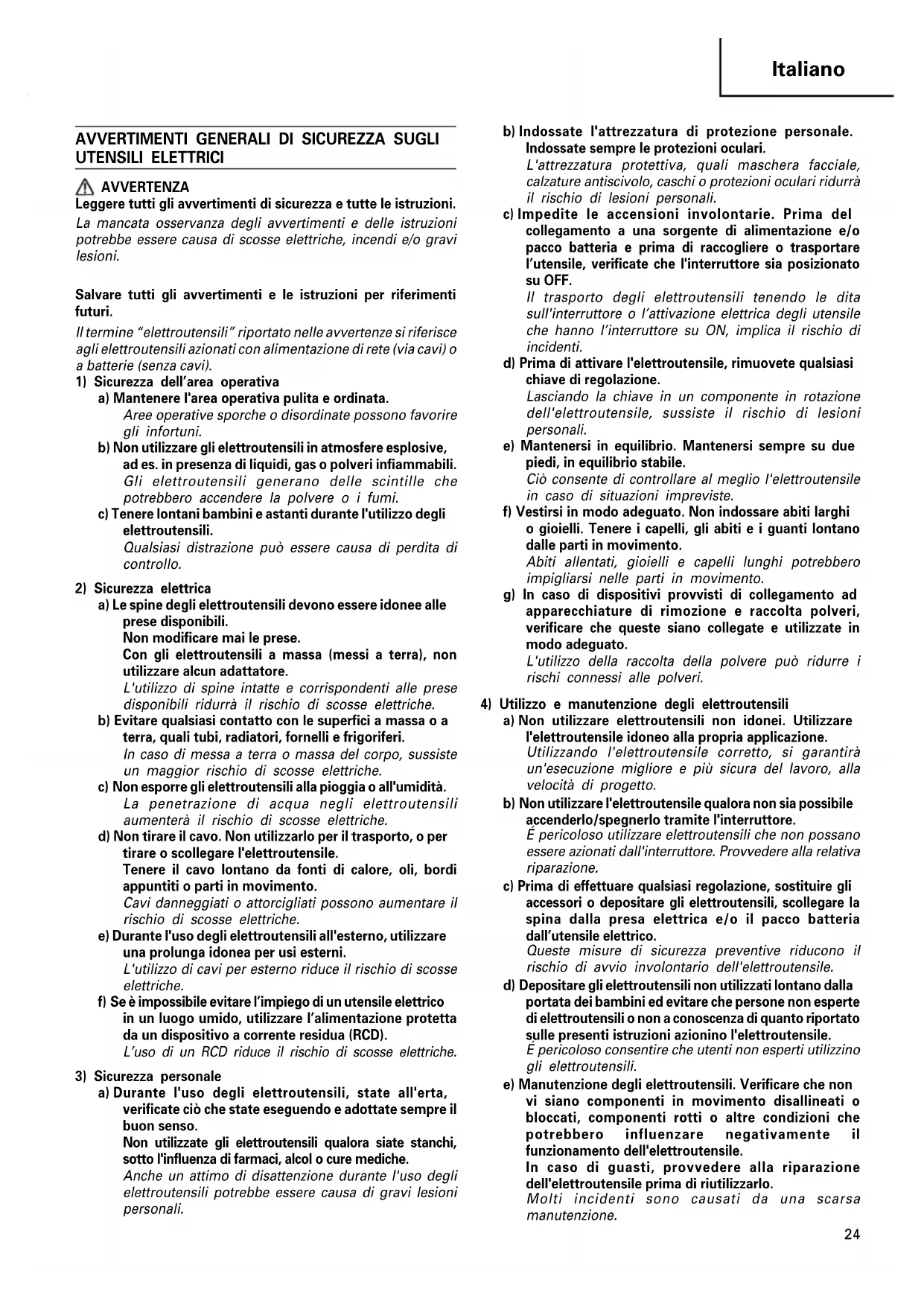 UTENSILI ELETTRICI AVVERTENZA Leggere tutti gli avvertimenti di sicurezza e tutte le istruzioni. La mancata osservanza degli avvertimenti e delle istruzioni potrebbe essere causa di scosse elettriche, incendi e/o gravi lesioni. Salvare tutti gli avvertimenti e le istruzioni per riferimenti futuri. Il termine “elettroutensili” riportato nelle avvertenze si riferisce agli elettroutensili azionati con alimentazione di rete (via cavi) o a batterie (senza cavi).