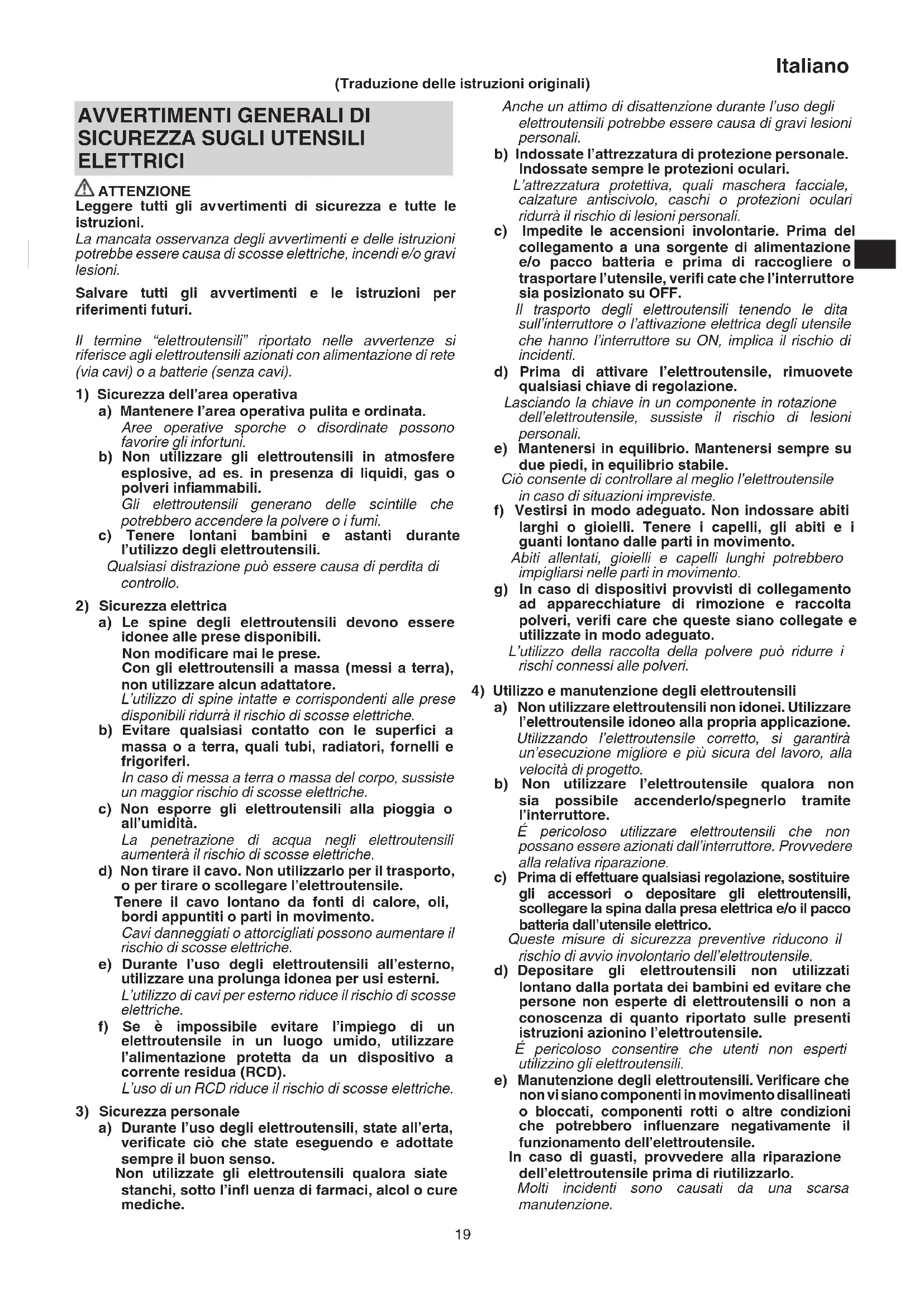 ELETTRICI ATTENZIONE Leggere tutti gli avvertimenti di sicurezza e tutte le istruzioni. La mancata osservanza degli avvertimenti e delle istruzioni potrebbe essere causa di scosse elettriche, incendi e/o gravi lesioni. Salvare tutti gli avvertimenti e le istruzioni per riferimenti futuri. Il termine “elettroutensili” riportato nelle avvertenze si riferisce agli elettroutensili azionati con alimentazione di rete (via cavi) o a batterie (senza cavi).