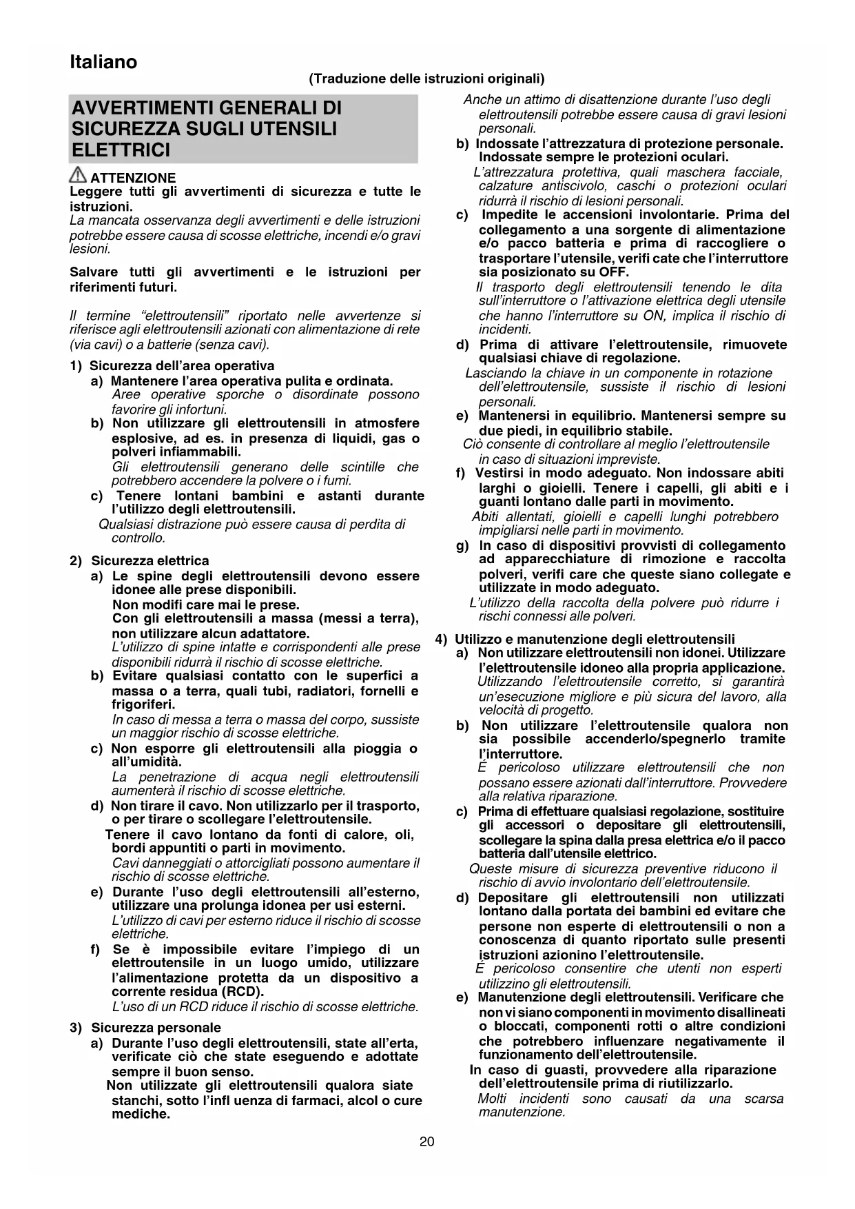 ELETTRICI ATTENZIONE Leggere tutti gli avvertimenti di sicurezza e tutte le istruzioni. La mancata osservanza degli avvertimenti e delle istruzioni potrebbe essere causa di scosse elettriche, incendi e/o gravi lesioni. Salvare tutti gli avvertimenti e le istruzioni per riferimenti futuri. Il termine “elettroutensili” riportato nelle avvertenze si riferisce agli elettroutensili azionati con alimentazione di rete (via cavi) o a batterie (senza cavi).