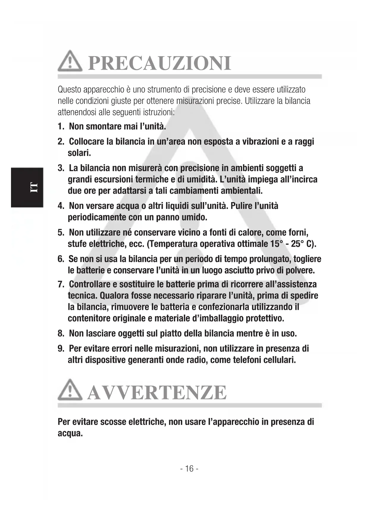 PRECAUZIONI Questo apparecchio è uno strumento di precisione e deve essere utilizzato nelle condizioni giuste per ottenere misurazioni precise. Utilizzare la bilancia attenendosi alle seguenti istruzioni: