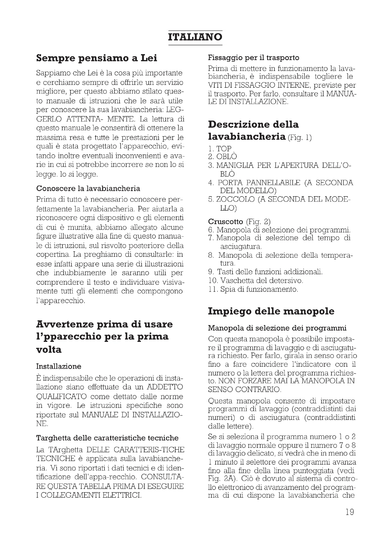ITALIANO LJ6A017N5 11/10/01 16:28 Página 18Sempre pensiamo a Lei Sappiamo che Lei è la cosa più importante e cerchiamo sempre di offrirle un servizio migliore, per questo abbiamo stilato ques- to manuale di istruzioni che le sarà utile per conoscere la sua lavabiancheria: LEG- GERLO ATTENTA- MENTE. La lettura di questo manuale le consentirà di ottenere la massima resa e tutte le prestazioni per le quali è stata progettato l’apparecchio, evi- tando inoltre eventuali inconvenienti e ava- rie in cui si potrebbe incorrere se non lo si legge. lo si legge. Conoscere la lavabiancheria Prima di tutto è necessario conoscere per- fettamente la lavabiancheria. Per aiutarla a riconoscere ogni dispositivo e gli elementi di cui è munita, abbiamo allegato alcune figure illustrative alla fine di questo manua- le di istruzioni, sul risvolto posteriore della copertina. La preghiamo di consultarle: in esse infatti appare una serie di illustrazioni che indubbiamente le saranno utili per comprendere il testo e individuare visiva- mente tutti gli elementi che compongono l’apparecchio. Avvertenze prima di usare l’pparecchio per la prima volta Installazione È indispensabile che le operazioni di insta- llazione siano effettuate da un ADDETTO QUALIFICATO come dettato dalle norme in vigore. Le istruzioni specifiche sono riportate sul MANUALE DI INSTALLAZIO- NE. Targhetta delle caratteristiche tecniche La TArghetta DELLE CARATTERIS-TICHE TECNICHE è applicata sulla lavabianche- ria. Vi sono riportati i dati tecnici e di iden- tificazione dell’appa-recchio. CONSULTA-