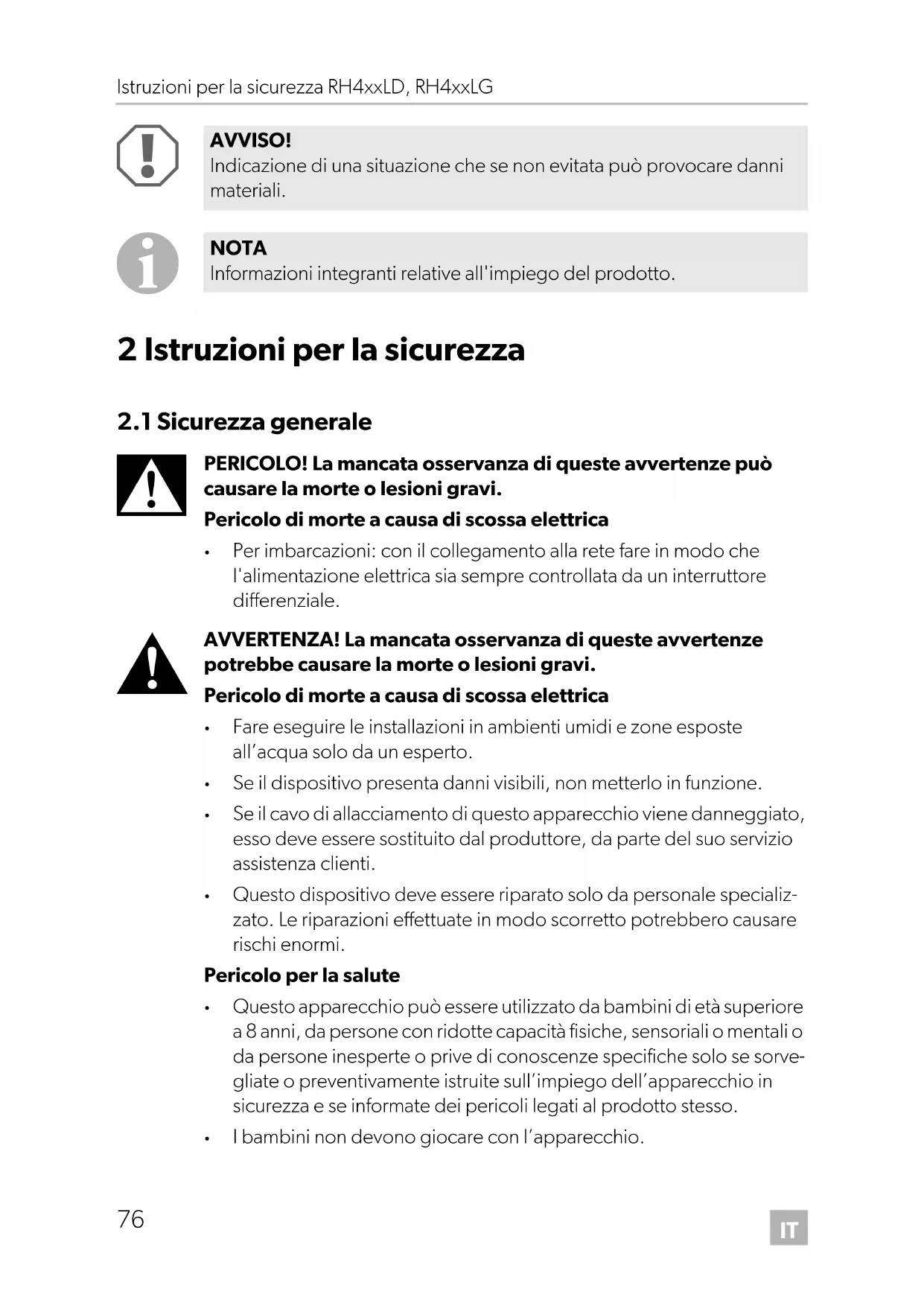 PERICOLO! Indicazione di sicurezza che segnala una situazione di pericolo che se non evitata provoca morte o gravi lesioni. AVVERTENZA! Indicazione di sicurezza che segnala una situazione di pericolo che se non evitata può provocare morte o gravi lesioni. ATTENZIONE! Indicazione di sicurezza che segnala una situazione di pericolo che se non evitata può provocare lesioni lievi o di gravità media. RH430-RH440-RH460-LD-LG--IO-16s.book Seite 75 Mittwoch, 17. Juli 2019 5:35 17IT Istruzioni per la sicurezza RH4xxLD, RH4xxLG