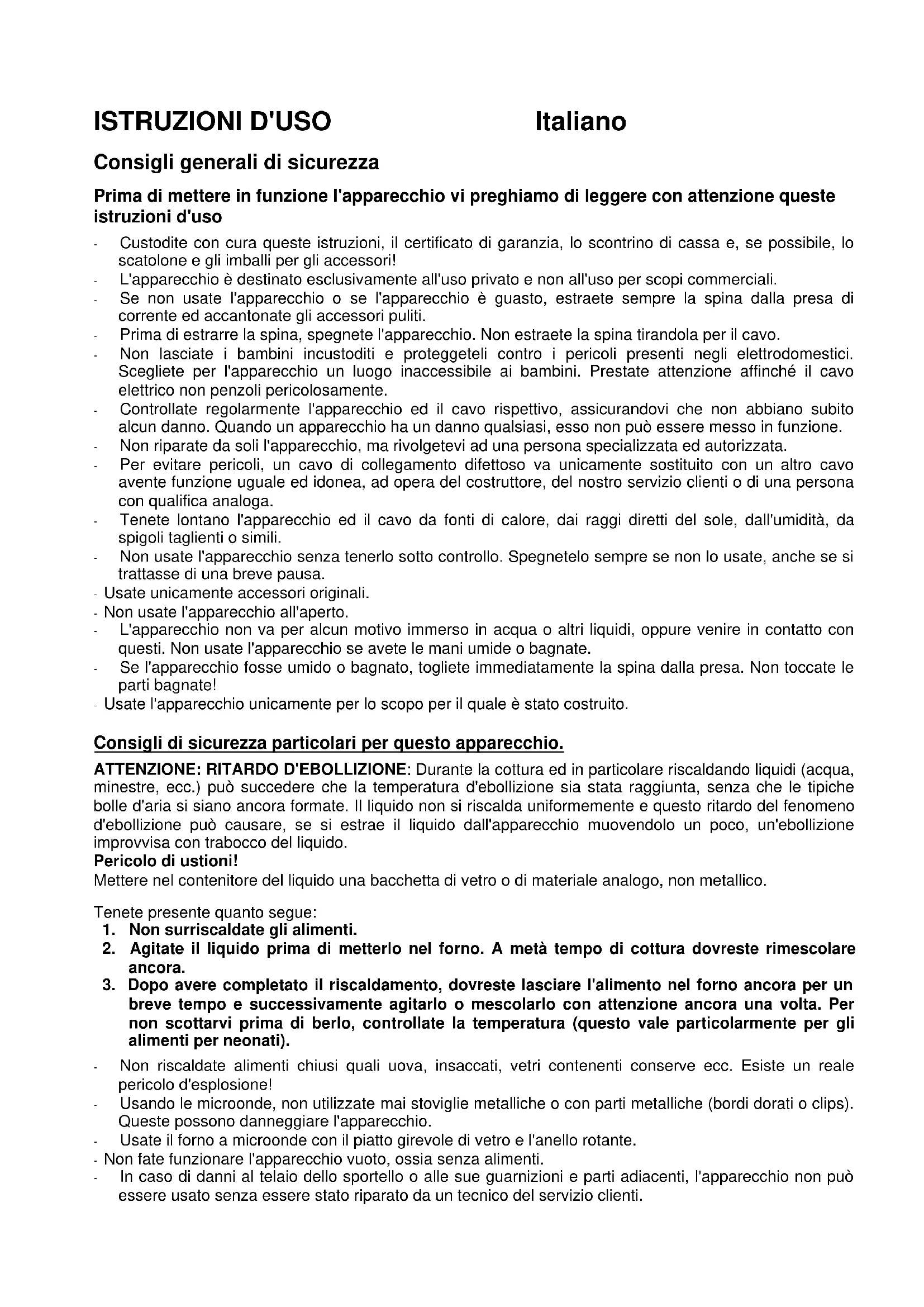 ATTENZIONE: RITARDO D'EBOLLIZIONE: Durante la cottura ed in particolare riscaldando liquidi (acqua, minestre, ecc.) può succedere che la temperatura d'ebollizione sia stata raggiunta, senza che le tipiche bolle d'aria si siano ancora formate. Il liquido non si riscalda uniformemente e questo ritardo del fenomeno d'ebollizione può causare, se si estrae il liquido dall'apparecchio muovendolo un poco, un'ebollizione improvvisa con trabocco del liquido.