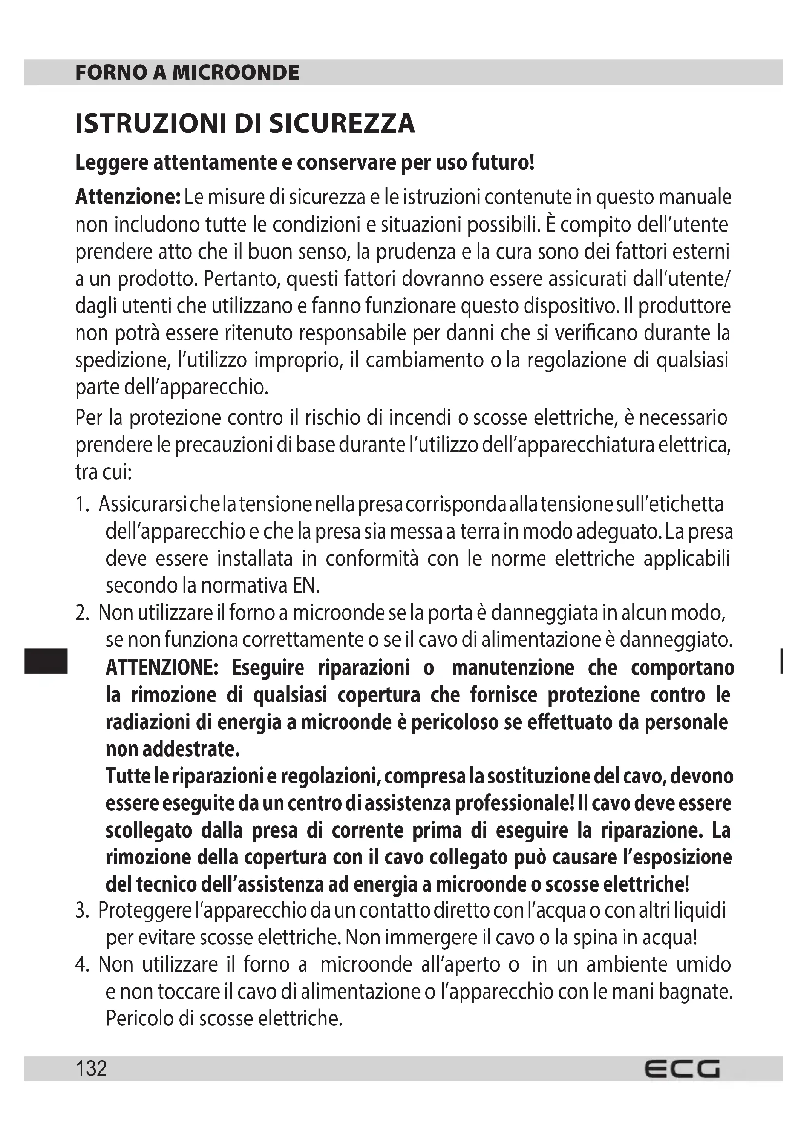 - Utilizzare il forno a microonde solo in conformità alle istruzioni di questo manuale. Questo forno a microonde è stato progettato ad uso esclusivamente domestico. Il produttore non è responsabile per danni causati da un uso improprio di questo apparecchio.
