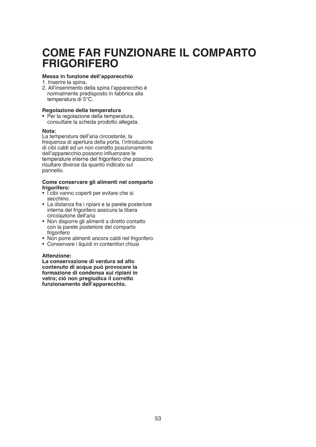 - Per la regolazione della temperatura, consultare la scheda prodotto allegata. Nota: La temperatura dell’aria circostante, la frequenza di apertura della porta, l’introduzione di cibi caldi ed un non corretto posizionamento dell’apparecchio possono influenzare le temperature interne del frigorifero che possono risultare diverse da quanto indicato sul pannello. Come conservare gli alimenti nel comparto frigorifero: