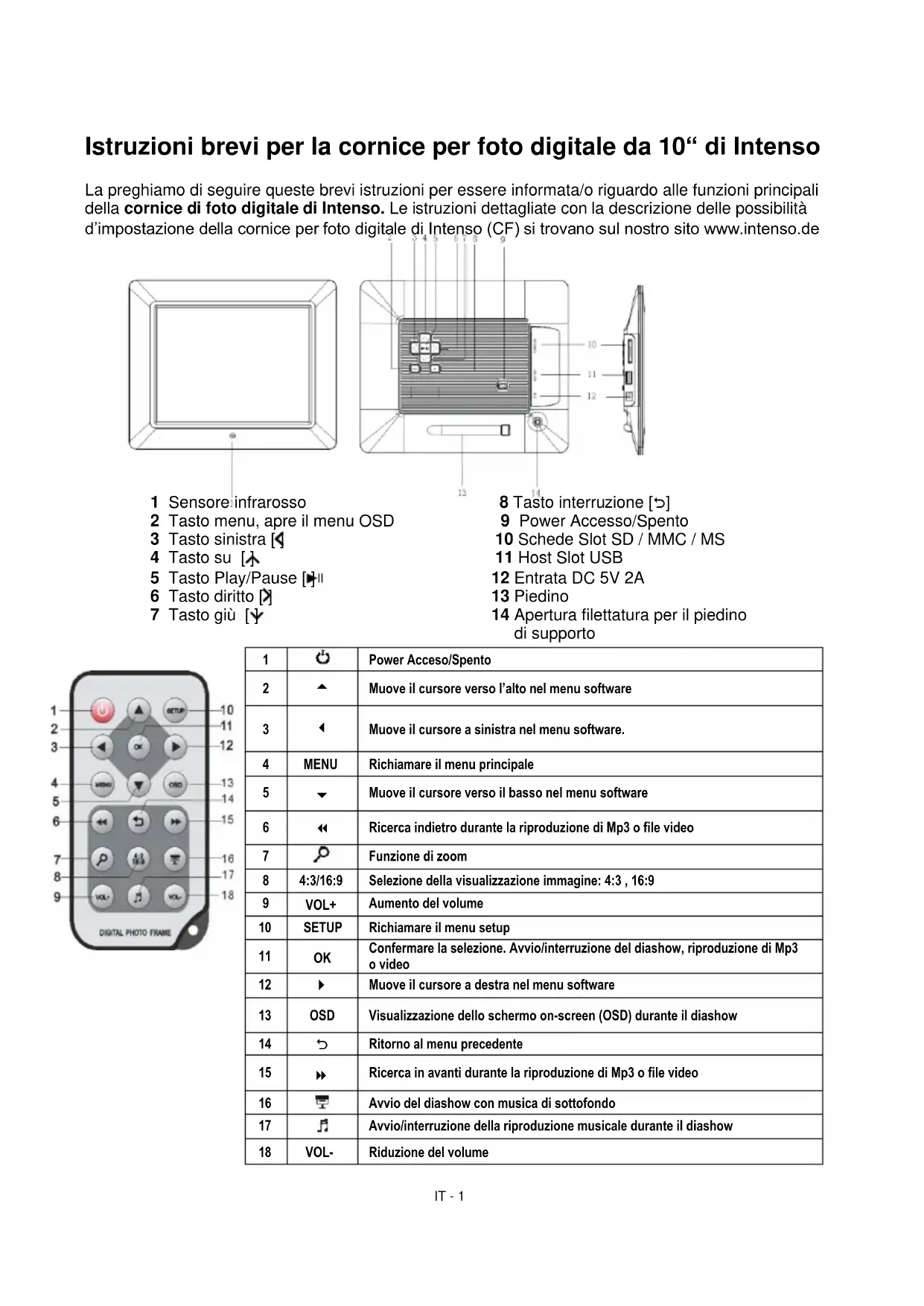 Devices marked with the WEEE logo are subject to the European Community Directive 2002/96/EC. Waste Electrical and Electronic Equipment must be separated from household rubbish and disposed at sites that collect WEEE. By orderly disposing WEEE you will avoid damage caused to the environment.IT - 1 Istruzioni brevi per la cornice per foto digitale da 10“ di Intenso La preghiamo di seguire queste brevi istruzioni per essere informata/o riguardo alle funzioni principali della cornice di foto digitale di Intenso. Le istruzioni dettagliate con la descrizione delle possibilità d‟impostazione della cornice per foto digitale di Intenso (CF) si trovano sul nostro sito www.intenso.de