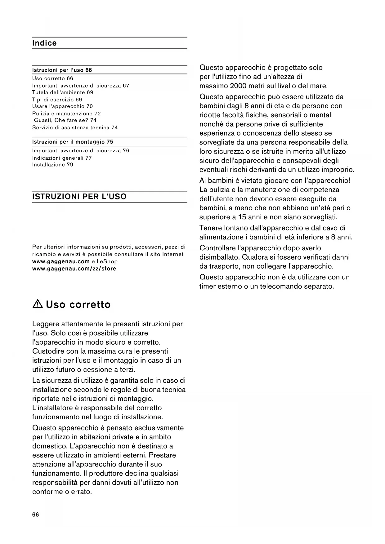 PP66 Indice [it]Istruzioni per l’uso e il montaggio Istruzioni per l’uso 66 Uso corretto 66 Importanti avvertenze di sicurezza 67 Tutela dell'ambiente 69 Tipi di esercizio 69 Usare l'apparecchio 70 Pulizia e manutenzione 72 Guasti, Che fare se? 74 Servizio di assistenza tecnica 74 Istruzioni per il montaggio 75 Importanti avvertenze di sicurezza 76 Indicazioni generali 77 Installazione 79