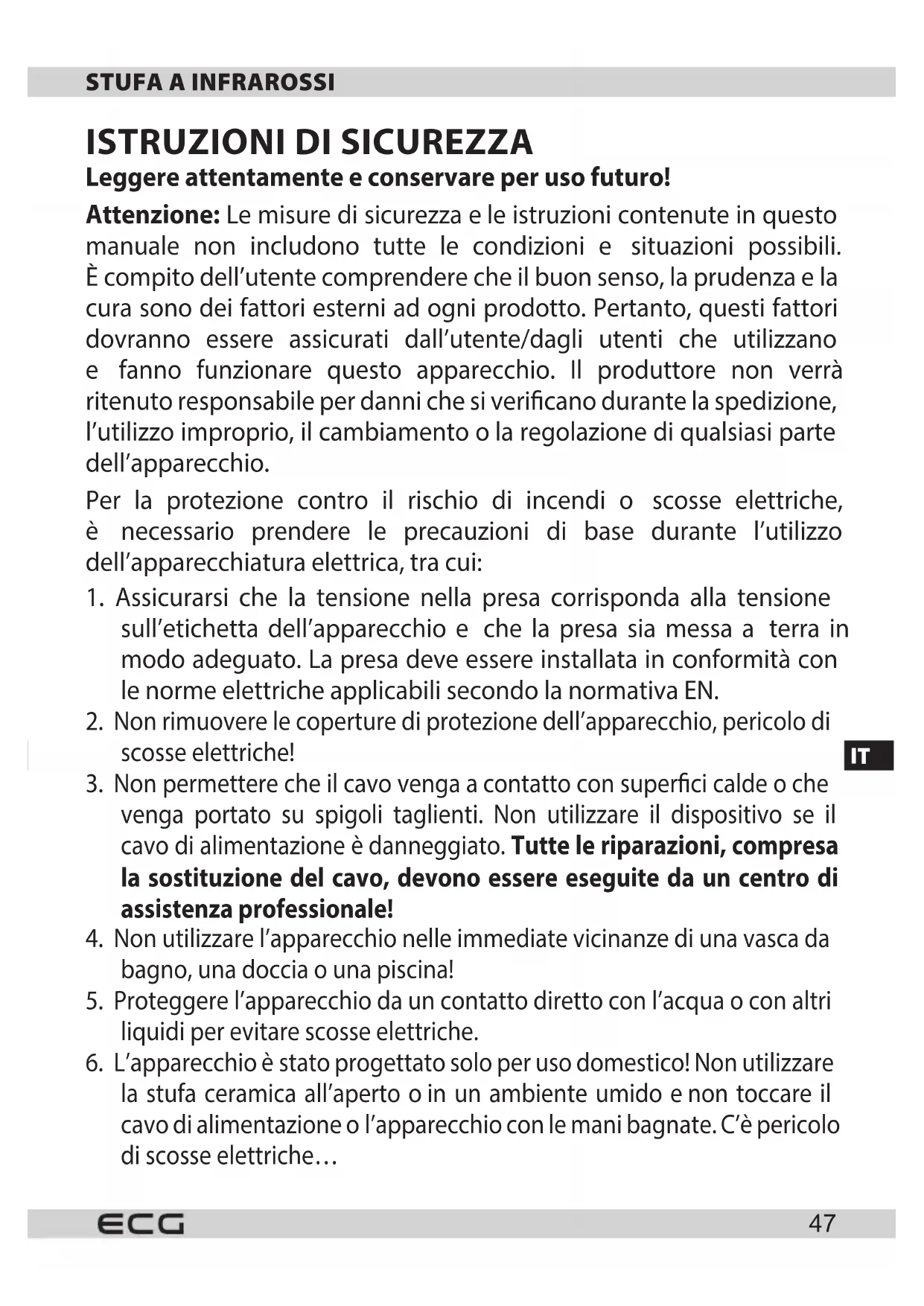 L'apparecchio è stato progettato solo per uso domestico! Non utilizzare la stufa ceramica all'aperto o in un ambiente umido e non toccare il cavo di alimentazione o l'apparecchio con le mani bagnate. C'è pericolo di scosse elettriche...