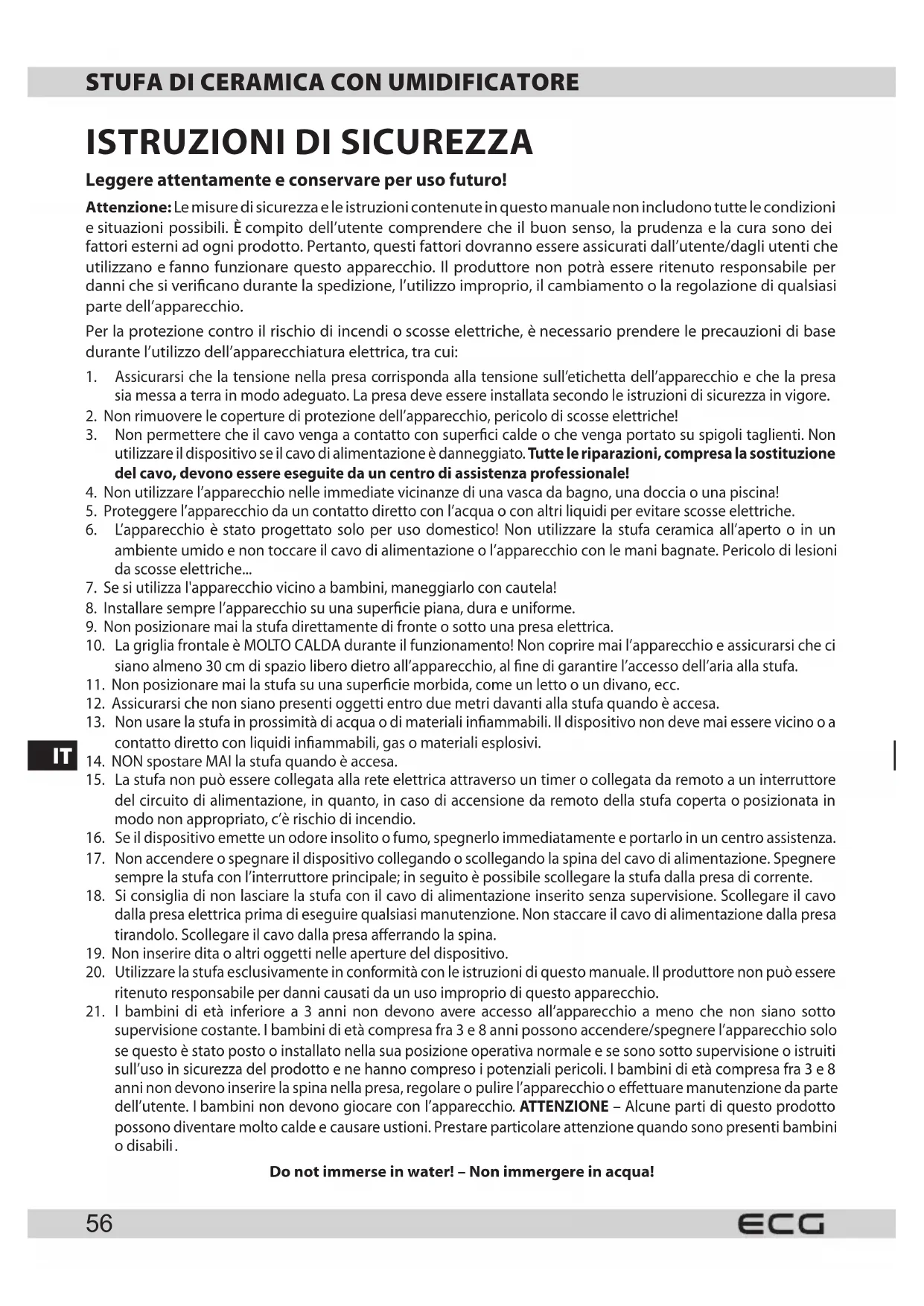 - Non usare la stufa in prossimità di acqua o di materiali inflammabili. Il disposito non deve mai essere vicino o a contatto diretto con liquidi inflammabili, gas o materiali esplosivi.