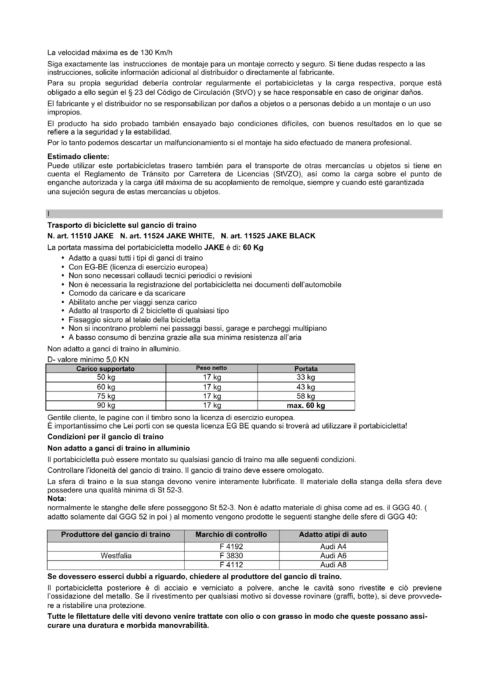 - A basso consumo di benzina grazie alla sua minima resistenza all’aria Non adatto a ganci di traino in alluminio. D- valore minimo 5,0 KN Carico supportato Peso netto Portata 50 kg 17 kg 33 kg 60 kg 17 kg 43 kg 75 kg 17 kg 58 kg 90 kg 17 kg max. 60 kg Gentile cliente, le pagine con il timbro sono la licenza di esercizio europea. È importantissimo che Lei porti con se questa licenza EG BE quando si troverà ad utilizzare il portabicicletta! Condizioni per il gancio di traino Non adatto a ganci di traino in alluminio Il portabicicletta può essere montato su qualsiasi gancio di traino ma alle seguenti condizioni. Controllare l’idoneità del gancio di traino. Il gancio di traino deve essere omologato. La sfera di traino e la sua stanga devono venire interamente lubrificate. Il materiale della stanga della sfera deve possedere una qualità minima di St 52-3. Nota: normalmente le stanghe delle sfere posseggono St 52-3. Non è adatto materiale di ghisa come ad es. il GGG 40. ( adatto solamente dal GGG 52 in poi ) al momento vengono prodotte le seguenti stanghe delle sfere di GGG 40: Produttore del gancio di traino Marchio di controllo Adatto atipi di auto