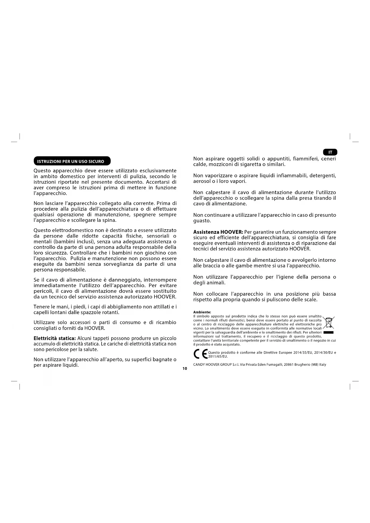 Questo apparecchio deve essere utilizzato esclusivamente in ambito domestico per interventi di pulizia, secondo le istruzioni riportate nel presente documento. Accertarsi di aver compreso le istruzioni prima di mettere in funzione l’apparecchio. Non lasciare l’apparecchio collegato alla corrente. Prima di procedere alla pulizia dell’apparecchiatura o di effettuare qualsiasi operazione di manutenzione, spegnere sempre l’apparecchio e scollegare la spina. Questo elettrodomestico non è destinato a essere utilizzato da persone dalle ridotte capacità fisiche, sensoriali o mentali (bambini inclusi), senza una adeguata assistenza o controllo da parte di una persona adulta responsabile della loro sicurezza. Controllare che i bambini non giochino con l’apparecchio. Pulizia e manutenzione non possono essere eseguite da bambini senza sorveglianza da parte di una persona responsabile. Se il cavo di alimentazione è danneggiato, interrompere immediatamente l’utilizzo dell’apparecchio. Per evitare pericoli, il cavo di alimentazione dovrà essere sostituito da un tecnico del servizio assistenza autorizzato HOOVER. Tenere le mani, i piedi, i capi di abbigliamento non attillati e i capelli lontani dalle spazzole rotanti. Utilizzare solo accessori o parti di consumo e di ricambio consigliati o forniti da HOOVER. Elettricità statica: Alcuni tappeti possono produrre un piccolo accumulo di elettricità statica. Le cariche di elettricità statica non sono pericolose per la salute. Non utilizzare l’apparecchio all’aperto, su superfici bagnate o per aspirare liquidi. Non aspirare oggetti solidi o appuntiti, fiammiferi, ceneri calde, mozziconi di sigaretta o similari. Non vaporizzare o aspirare liquidi infiammabili, detergenti, aerosol o i loro vapori. Non calpestare il cavo di alimentazione durante l’utilizzo dell’apparecchio o scollegare la spina dalla presa tirando il cavo di alimentazione. Non continuare a utilizzare l’apparecchio in caso di presunto guasto. Assistenza HOOVER: Per garantire un funzionamento sempre sicuro ed efficiente dell’apparecchiatura, si consiglia di fare eseguire eventuali interventi di assistenza o di riparazione dai tecnici del servizio assistenza autorizzato HOOVER. Non calpestare il cavo di alimentazione o avvolgerlo intorno alle braccia o alle gambe mentre si usa l’apparecchio. Non utilizzare l’apparecchio per l’igiene della persona o degli animali. Non collocare l’apparecchio in una posizione più bassa rispetto alla propria quando si puliscono delle scale. Ambiente: Il simbolo apposto sul prodotto indica che lo stesso non può essere smaltito come i normali rifiuti domestici, bensì deve essere portato al punto di raccolta o al centro di riciclaggio delle apparecchiature elettriche ed elettroniche più vicino. Lo smaltimento deve essere eseguito in conformità alle normative locali vigenti per la salvaguardia dell’ambiente e lo smaltimento dei rifiuti. Per ulteriori informazioni sul trattamento, il recupero e il riciclaggio di questo prodotto, contattare l’unità territoriale competente per il servizio di smaltimento o il negozio in cui il prodotto è stato acquistato. Questo prodotto è conforme alle Direttive Europee 2014/35/EU, 2014/30/EU e 2011/65/EU. CANDY HOOVER GROUP S.r.l. Via Privata Eden Fumagalli, 20861 Brugherio (MB) Italy