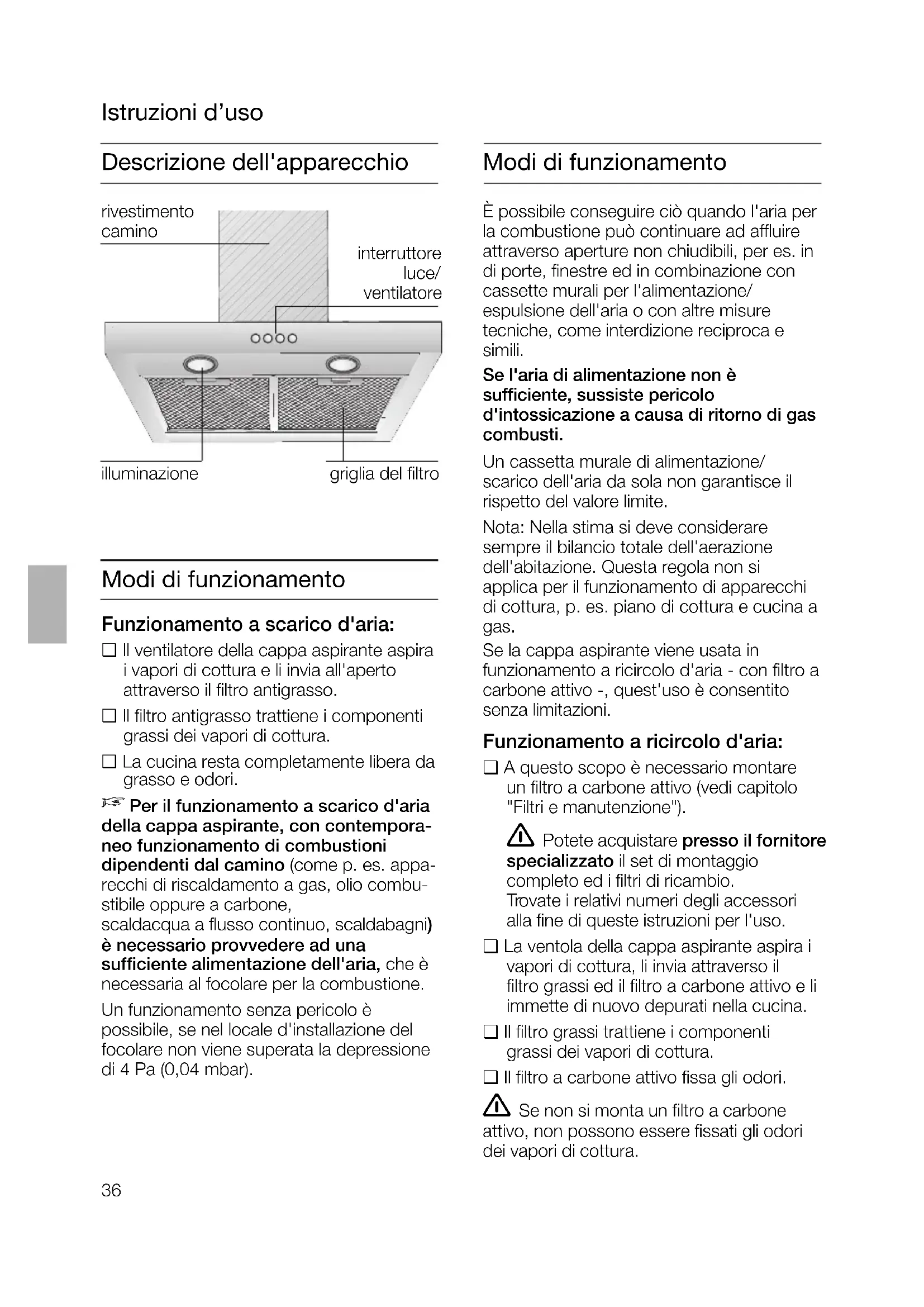 gebruiksaanwijzing).36 Descrizione dell'apparecchio Modi di funzionamento Funzionamento a scarico d'aria: ❑ Il ventilatore della cappa aspirante aspira i vapori di cottura e li invia all'aperto attraverso il filtro antigrasso. ❑ Il filtro antigrasso trattiene i componenti grassi dei vapori di cottura. ❑ La cucina resta completamente libera da grasso e odori.