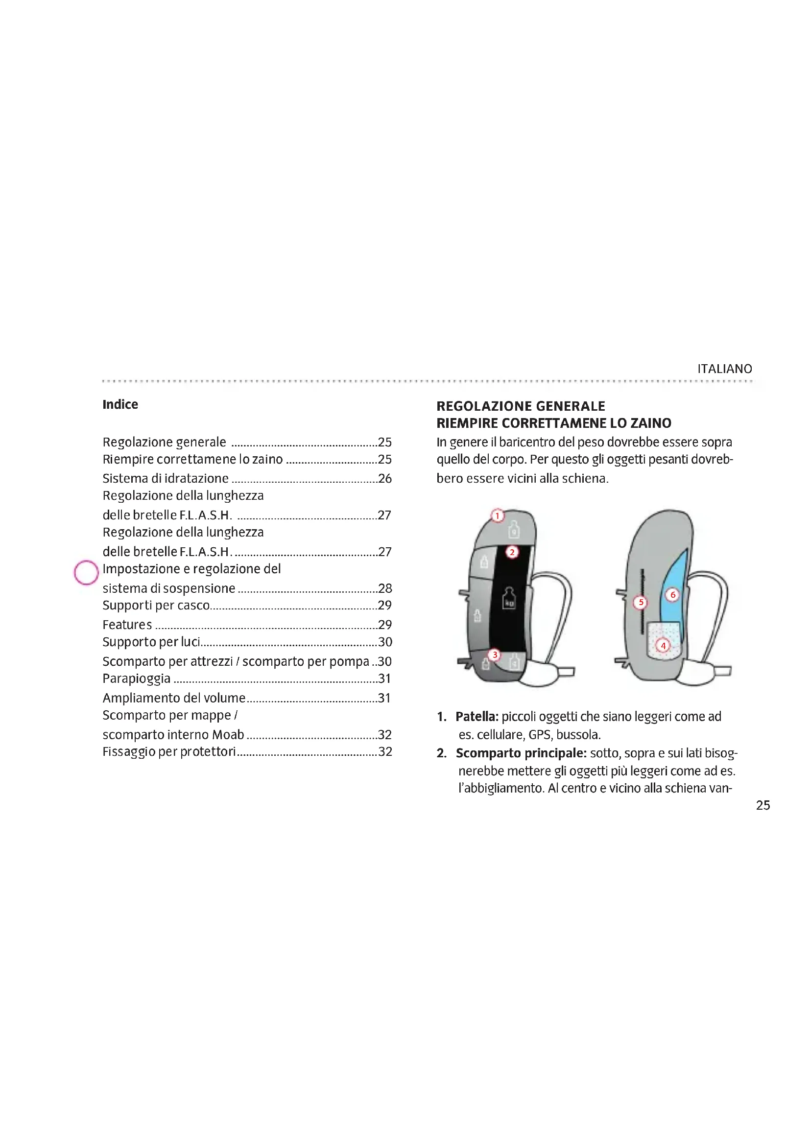 l’intero peso viene sostenuto dalle anche. Poi tirare di nuovo leggermente le bretelle per stabilizzare lo zaino nella zona delle spalle.29 ITALIANO