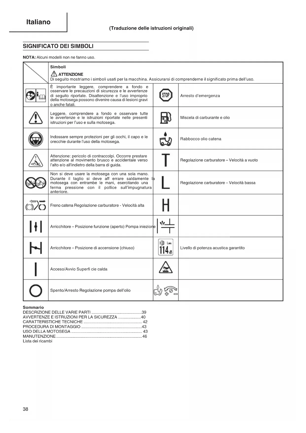 NOTA: Alcuni modelli non ne fanno uso. Simboli ATTENZIONE Di seguito mostriamo i simboli usati per la macchina. Assicurarsi di comprenderne il signifi cato prima dell’uso. È importante leggere, comprendere a fondo e osservare le precauzioni di sicurezza e le avvertenze di seguito riportate. Disattenzione e l’uso improprio della motosega possono divenire causa di lesioni gravi o anche fatali. Arresto d’emergenza Leggere, comprendere a fondo e osservare tutte le avvertenze e le istruzioni riportate nelle presenti istruzioni per l’uso e sulla motosega. Miscela di carburante e olio Indossare sempre protezioni per gli occhi, il capo e le orecchie durante l’uso della motosega. Rabbocco olio catena Attenzione: pericolo di contraccolpi. Occorre prestare attenzione al movimento brusco e accidentale verso l’alto e/o all’indietro della barra di guida. Regolazione carburatore – Velocità a vuoto Non si deve usare la motosega con una sola mano. Durante il taglio si deve aff errare saldamente la motosega con entrambe le mani, esercitando una ferma pressione con il pollice sull’impugnatura anteriore. Regolazione carburatore – Velocità bassa Freno catena Regolazione carburatore - Velocità alta Arricchitore – Posizione funzione (aperto) Pompa iniezione Arricchitore – Posizione di accensione (chiuso)