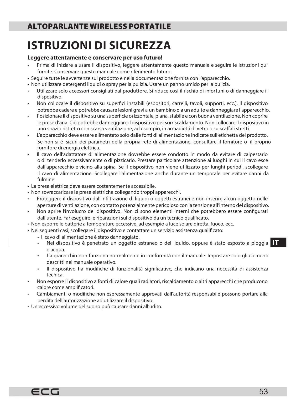 Scarica le istruzioni per il tuo Altoparlante in formato PDF gratuitamente! Trova il tuo manuale BTS Elysium S1 - ECG e riprendi in mano il tuo dispositivo elettronico. In questa pagina sono pubblicati tutti i documenti necessari per l'utilizzo del tuo dispositivo. BTS Elysium S1 del marchio ECG.