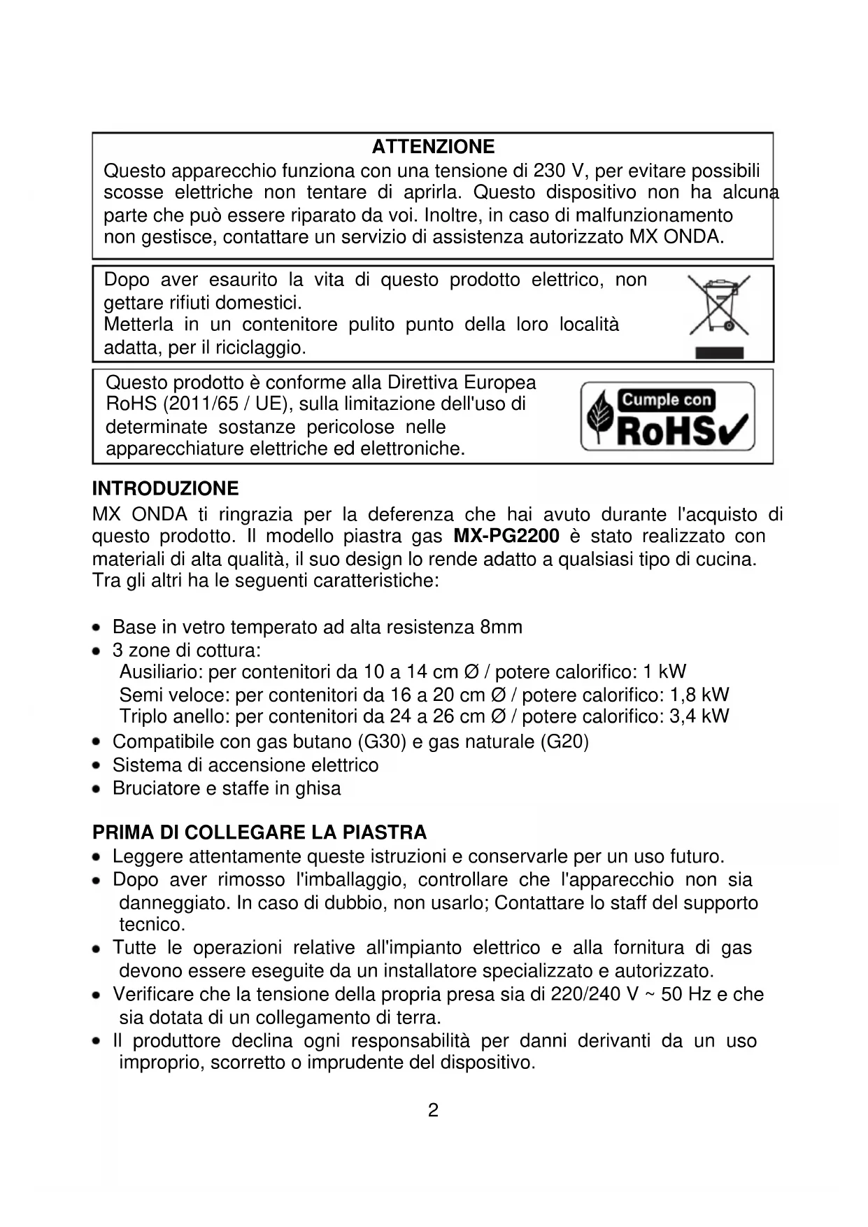MX ONDA ti ringrazia per la deferenza che hai avuto durante l'acquisto di questo prodotto. Il modello piastra gas MX-PG2200 è stato realizzato con materiali di alta qualità, il suo design lo rende adatto a qualsiasi tipo di cucina.