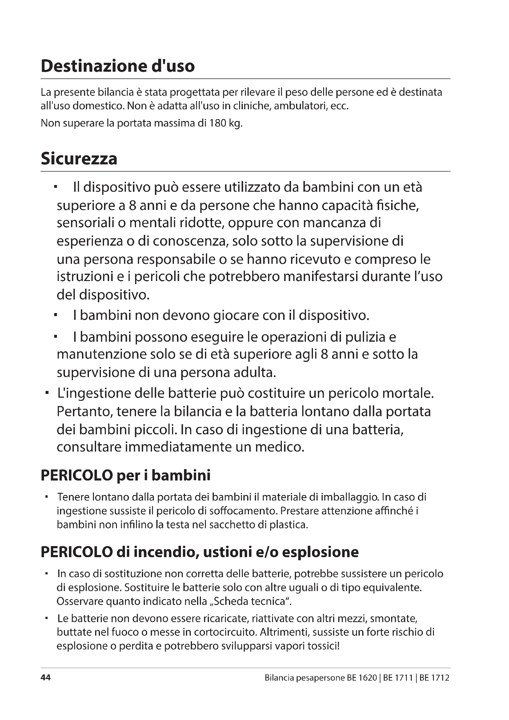 Bilancia pesapersone BE 1620 | BE 1711 | BE 1712 Destinazione d'uso La presente bilancia è stata progettata per rilevare il peso delle persone ed è destinata all'uso domestico. Non è adatta all'uso in cliniche, ambulatori, ecc. Non superare la portata massima di 180 kg. Sicurezza Il dispositivo può essere utilizzato da bambini con un età superiore a 8 anni e da persone che hanno capacità siche, sensoriali o mentali ridotte, oppure con mancanza di esperienza o di conoscenza, solo sotto la supervisione di una persona responsabile o se hanno ricevuto e compreso le istruzioni e i pericoli che potrebbero manifestarsi durante l’uso del dispositivo. I bambini non devono giocare con il dispositivo. I bambini possono eseguire le operazioni di pulizia e manutenzione solo se di età superiore agli 8 anni e sotto la supervisione di una persona adulta. L'ingestione delle batterie può costituire un pericolo mortale. Pertanto, tenere la bilancia e la batteria lontano dalla portata dei bambini piccoli. In caso di ingestione di una batteria, consultare immediatamente un medico. PERICOLO per i bambini Tenere lontano dalla portata dei bambini il materiale di imballaggio. In caso di ingestione sussiste il pericolo di soocamento. Prestare attenzione anché i bambini non inlino la testa nel sacchetto di plastica. PERICOLO di incendio, ustioni e/o esplosione In caso di sostituzione non corretta delle batterie, potrebbe sussistere un pericolo di esplosione. Sostituire le batterie solo con altre uguali o di tipo equivalente. Osservare quanto indicato nella „Scheda tecnica“. Le batterie non devono essere ricaricate, riattivate con altri mezzi, smontate, buttate nel fuoco o messe in cortocircuito. Altrimenti, sussiste un forte rischio di esplosione o perdita e potrebbero svilupparsi vapori tossici! Druckbuch Personenwaage Div.indb 44 14.03.2017 12:28:12Sicurezza