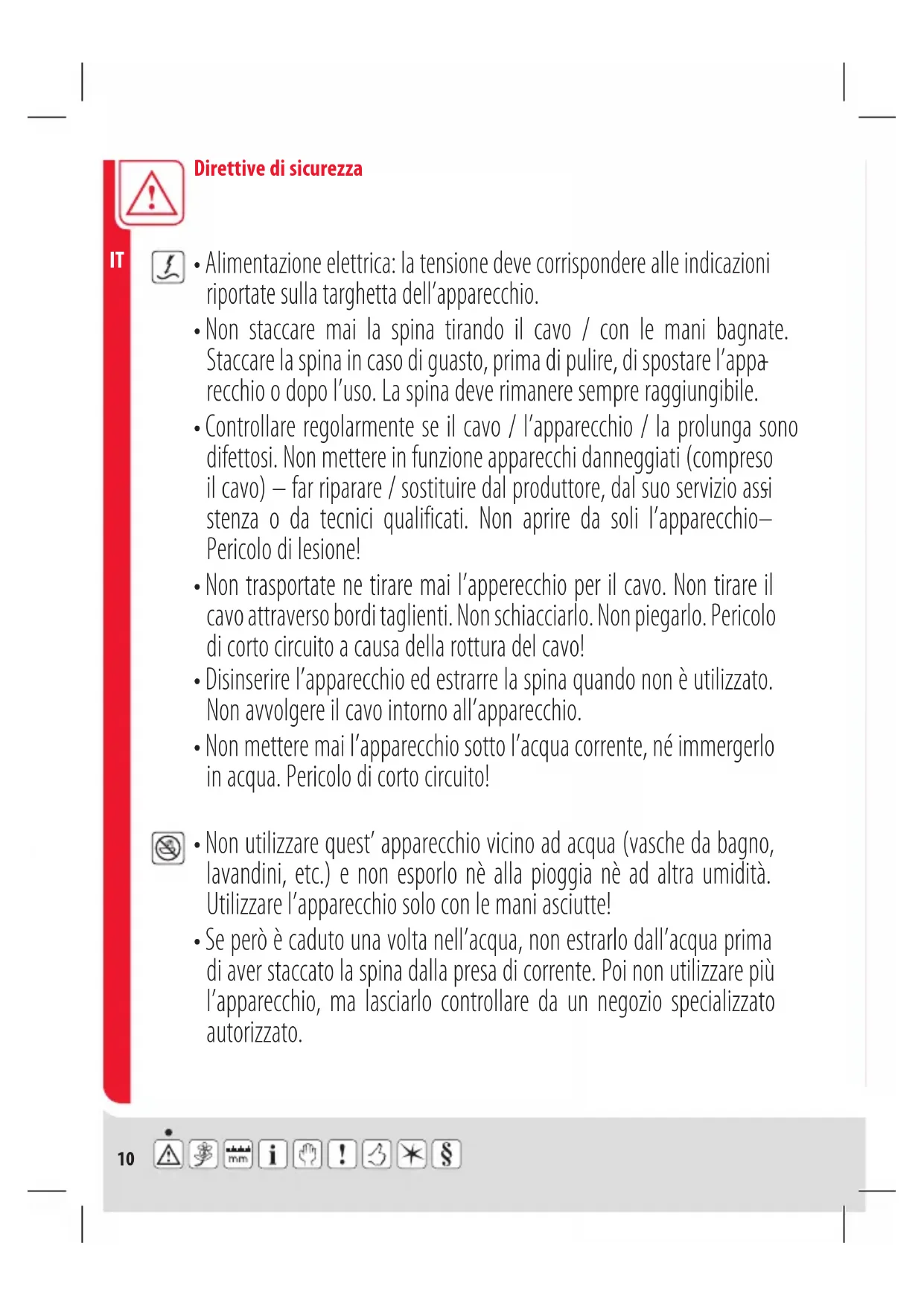 - Non mettere mai l’apparecchio sotto l’acqua corrente, né immergerlo in acqua. Pericolo di corto circuito!