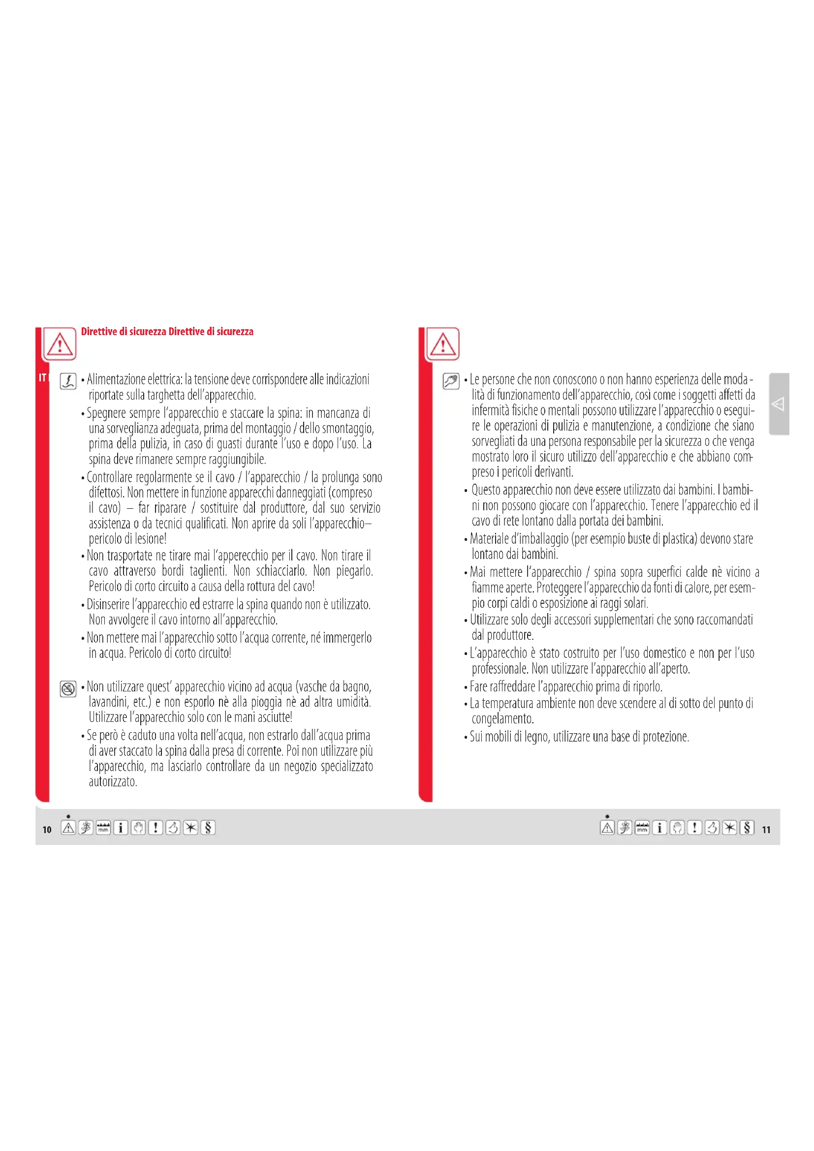 - Le riparazioni degli apparecchi elettrici devono unicamente essere effettuate da specialisti. Le riparazioni improprie possono causare dei pericoli gravi per l’utente. Direttive di sicurezza