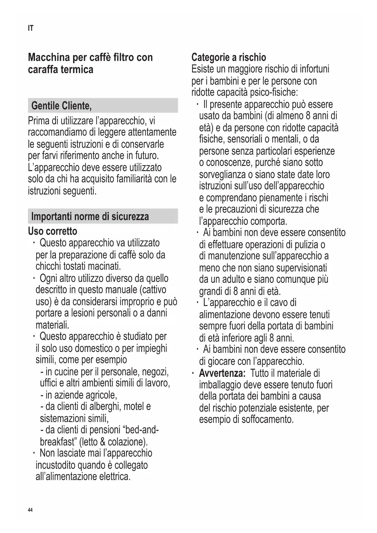 Ajuste el interruptor a la posición . Si no consigue resolver el problema con este cuadro, póngase en contacto con nuestro Servicio de Atención al Cliente. Los datos de contacto se encuentran en el apéndice de este manual.44 142 x 208 mm Macchina per caffè ltro con caraffa termica Gentile Cliente, Prima di utilizzare l’apparecchio, vi raccomandiamo di leggere attentamente le seguenti istruzioni e di conservarle per farvi riferimento anche in futuro. L’apparecchio deve essere utilizzato solo da chi ha acquisito familiarità con le istruzioni seguenti. Importanti norme di sicurezza Uso corretto ∙ Questo apparecchio va utilizzato per la preparazione di caffè solo da chicchi tostati macinati. ∙ Ogni altro utilizzo diverso da quello descritto in questo manuale (cattivo uso) è da considerarsi improprio e può portare a lesioni personali o a danni materiali