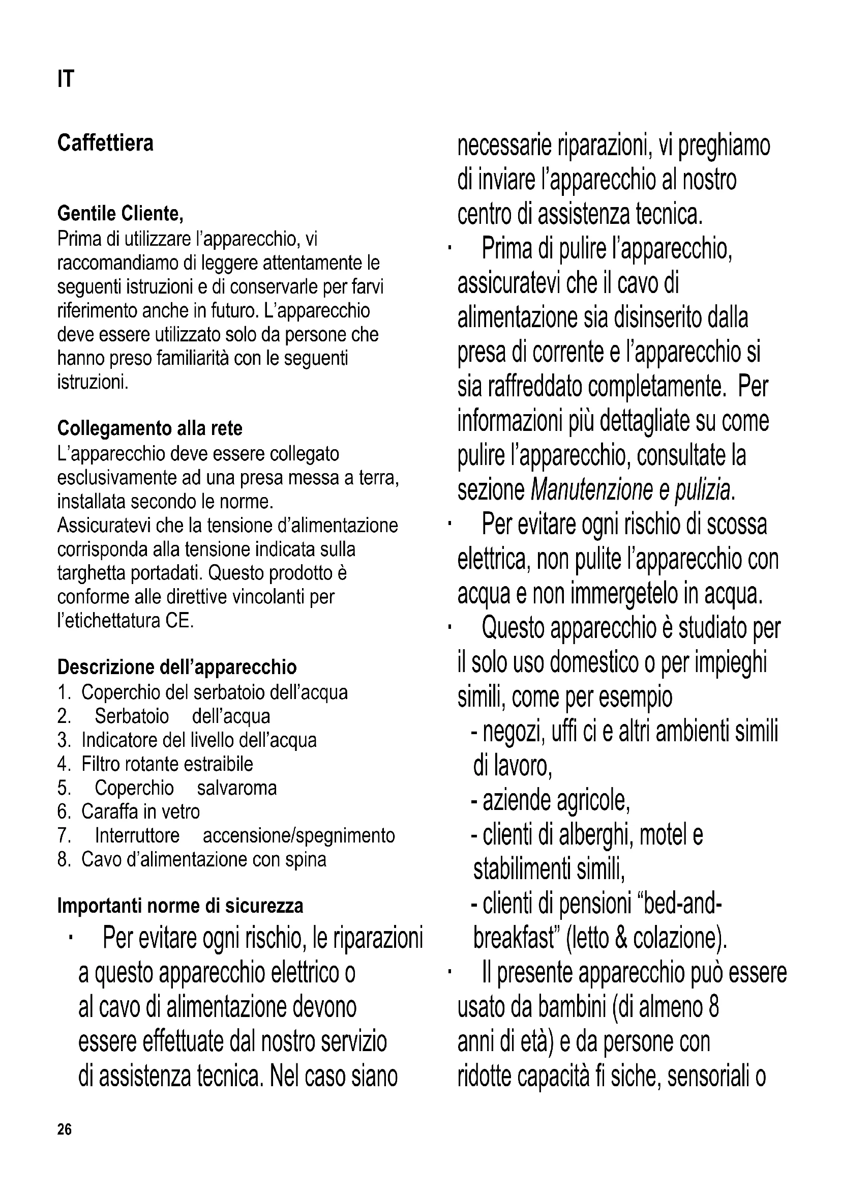 Importanti norme di sicurezza ∙ Per evitare ogni rischio, le riparazioni a questo apparecchio elettrico o al cavo di alimentazione devono essere effettuate dal nostro servizio di assistenza tecnica. Nel caso siano necessarie riparazioni, vi preghiamo di inviare l’apparecchio al nostro centro di assistenza tecnica. ∙ Prima di pulire l’apparecchio, assicuratevi che il cavo di alimentazione sia disinserito dalla presa di corrente e l’apparecchio si sia raffreddato completamente. Per informazioni più dettagliate su come pulire l’apparecchio, consultate la sezione Manutenzione e pulizia. ∙ Per evitare ogni rischio di scossa elettrica, non pulite l’apparecchio con acqua e non immergetelo in acqua. ∙ Questo apparecchio è studiato per il solo uso domestico o per impieghi simili, come per esempio - negozi, uffi ci e altri ambienti simili di lavoro, - aziende agricole, - clienti di alberghi, motel e stabilimenti simili, - clienti di pensioni “bed-and- breakfast” (letto & colazione). ∙ Il presente apparecchio può essere usato da bambini (di almeno 8 anni di età) e da persone con ridotte capacità fi siche, sensoriali o IT27 mentali, o persone senza particolari esperienze o conoscenze, purché siano sotto sorveglianza o siano state date loro istruzioni sull’uso dell’apparecchio e comprendano pienamente i rischi e le precauzioni di sicurezza che l’apparecchio comporta. ∙ Ai bambini non deve essere consentito di giocare con l’apparecchio. ∙ Ai bambini non deve essere consentito di effettuare operazioni di pulizia o di manutenzione sull’apparecchio a meno che non siano supervisionati da un adulto e siano comunque più grandi di 8 anni di età. ∙ L’apparecchio e il cavo di alimentazione devono essere tenuti sempre fuori della portata di bambini di età inferiore agli 8 anni. ∙ Avvertenza: Tutto il materiale di imballaggio deve essere tenuto fuori della portata dei bambini a causa del rischio potenziale esistente, per esempio di soffocamento. ∙ Prima di ogni utilizzo dell’apparecchio, controllate attentamente che l’apparecchio e gli accessori inseriti non presentino tracce di deterioramento. Se per esempio fosse caduto battendo su una superfi cie dura, o se è stata usata una forza eccessiva nel tirare il cavo di alimentazione, l’apparecchio non va più usato: danni anche invisibili ad occhio nudo potrebbero comportare conseguenze negative sulla sicurezza nel funzionamento dell’apparecchio. ∙ Prima dell’uso, accertatevi che il manico della caraffa in vetro sia fermamente e correttamente inserito. Se lo ritenete necessario, potete stringere l’anello di metallo tramite la vite posta sul manico. ∙ Durante l’uso, la caffettiera va installata sopra ad una superfi cie piana, antiscivolo e impermeabile agli spruzzi e alle macchie. ∙ Evitate che il cavo di alimentazione tocchi fonti di calore o superfi ci calde. ∙ Avvertenza: la piastra elettrica diventa molto calda durante il funzionamento. ∙ Per evitare che l’acqua bollente o il vapore fuoriesca, spegnete la caffettiera e lasciate sempre raffreddare l’apparecchio prima di aprirlo o di rimuovere parti dell’apparecchio o qualcuno degli accessori. ∙ È necessario sorvegliare che i bambini non giochino con l’apparecchio. ∙ Disinserite la spina dalla presa di corrente a muro - in caso di malfunzionamento, - durante le operazioni di pulizia, - se l’apparecchio dovrà rimanere inutilizzato per un lungo periodo di tempo. ∙ Per disinserire la spina dalla presa di corrente, non tirate mai il cavo di alimentazione ma afferrate direttamente la spina. ∙ Non lasciate pendere liberamente il cavo di alimentazione; tenete il cavo lontano28 dalle parti dell’apparecchio soggette a riscaldarsi. ∙ Nessuna responsabilità verrà assunta in caso di danni risultanti da un uso errato o dalla non conformità alle istruzioni. Per il primo utilizzo Per preparare il caffè la prima volta, fate compiere all’apparecchio due o tre cicli di infusione utilizzando la quantità d’acqua massima indicata, senza però aggiungerci caffè macinato. Ripetete la stessa operazione anche dopo dei periodi prolungati di non utilizzo e dopo aver disincrostato dal calcare l’apparecchio. Informazioni generali ∙ Le tacche di misurazione presenti sul serbatoio dell’acqua e sulla caraffa in vetro facilitano l’operazione di riempimento del serbatoio con la giusta quantità di acqua. E’ presente una doppia misurazione: quella di sinistra indica la quantità di acqua per delle tazze regolari di circa 125 ml., mentre quella di destra serve per dosare delle tazze più piccole. Accertatevi sempre di non superare il livello massimo di quantità d’acqua. ∙ Se dovete eseguire diversi cicli di infusione consecutivi, vi raccomandiamo di spegnere la caffettiera dopo ogni ciclo e di lasciare raffreddare l’apparecchio per almeno 5 minuti. ∙ Osservazione importante: Se riempite l’apparecchio con acqua fresca subito dopo un precedente ciclo di infusione, c’è il pericolo di procurarsi scottature a causa dell’acqua calda o del vapore che fuoriesce. Preparazione del caffè ∙ Riempimento del serbatoio dell’acqua: Aprite il coperchio del serbatoio dell’acqua, riempite il serbatoio con la quantità di acqua desiderata e richiudete il coperchio. ∙ Inserimento del fi ltro di carta: Aprite il fi ltro rotante lateralmente e inserite un fi ltro in carta 1 x 4, ripiegandolo prima sui lati perforati del fi ltro. ∙ Riempimento con caffè macinato: Per ogni tazza regolare (da 125 ml.), aggiungete un misurino di circa 6 g. (= 1½ - 2 cucchiaini) di caffè macinato fi nemente e poi chiudete il fi ltro rotante. ∙ Preparazione della caraffa di vetro: Inserite il fi ltro salvaroma sulla caraffa e poi sistemate la caraffa nell’apparecchio. Se il coperchio è inserito correttamente, durante il ciclo di infusione si disattiverà il meccanismo anti-goccia posto sul supporto del fi ltro. ∙ Inizio del ciclo di infu