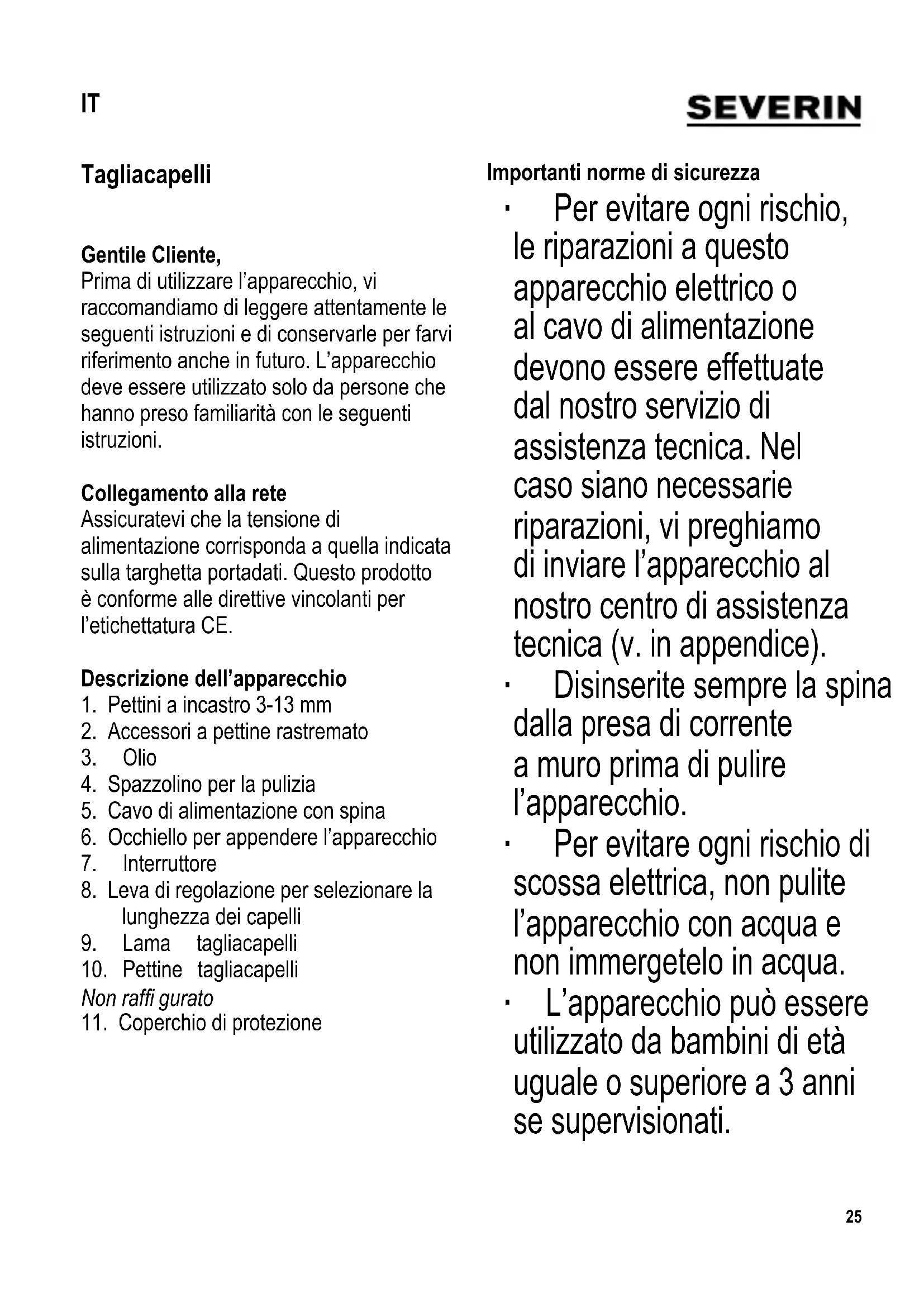 Importanti norme di sicurezza ∙ Per evitare ogni rischio, le riparazioni a questo apparecchio elettrico o al cavo di alimentazione devono essere effettuate dal nostro servizio di assistenza tecnica. Nel caso siano necessarie riparazioni, vi preghiamo di inviare l’apparecchio al nostro centro di assistenza tecnica (v. in appendice). ∙ Disinserite sempre la spina dalla presa di corrente a muro prima di pulire l’apparecchio. ∙ Per evitare ogni rischio di scossa elettrica, non pulite l’apparecchio con acqua e non immergetelo in acqua. ∙ L’apparecchio può essere utilizzato da bambini di età uguale o superiore a 3 anni se supervisionati. IT26 ∙ Il presente apparecchio può essere usato da bambini (di almeno 8 anni di età) e da persone con ridotte capacità fi siche, sensoriali o mentali, o persone senza particolari esperienze o conoscenze, purché siano sotto sorveglianza o siano state date loro istruzioni sull’uso dell’apparecchio e comprendano pienamente i rischi e le precauzioni di sicurezza che l’apparecchio comporta. ∙ Ai bambini non deve essere consentito di giocare con l’apparecchio. ∙ La pulizia e la manutenzione da parte dell’utente non devono essere eseguite da bambini senza adeguata supervisione. ∙ L’apparecchio e il cavo di alimentazione devono essere tenuti sempre fuori della portata di bambini di età inferiore agli 3 anni. ∙ Avvertenza: Tutto il materiale di imballaggio deve essere tenuto fuori della portata dei bambini a causa del rischio potenziale esistente, per esempio di soffocamento. ∙ Avvertenza: Non utilizzate l’apparecchio vicino a vasche da bagno o lavandini se riempiti di acqua o comunque vicino a altri recipienti contenenti acqua. ∙ Avvertenza: Proteggete l’apparecchio dall’umidità, e non usatelo con le mani bagnate. ∙ Se utilizzate l’apparecchio in una sala da bagno, la presenza dell’acqua rappresenta comunque un pericolo, anche ad apparecchio spento. Vi raccomandiamo perciò di rimuovere sempre la spina dalla presa di corrente a muro dopo ogni uso. Per una maggior sicurezza durante l’uso dell’apparecchio, è consigliabile installare un interruttore magnetotermico differenziale con corrente di intervento minima non superiore a 30 mA (IF < 30 mA). Contattate il vostro elettricista di fi ducia per avere maggiori dettagli.27 ∙ Prima di ogni utilizzo, controllate attentamente che l’apparecchio non presenti tracce di deterioramento. Non usate l’apparecchio nel caso in cui lo stesso abbia incidentalmente subito colpi: danni anche invisibili ad occhio nudo potrebbero comportare conseguenze negative sulla sicurezza nel funzionamento dell’apparecchio. ∙ Spegnete sempre l’apparecchio e disinserite la spina dalla presa di corrente dopo l’uso nonché - in caso di cattivo funzionamento, - mentre effettuate la pulizia dell’apparecchio. ∙ Non tirate mai il cavo di alimentazione mentre disinserite la spina dalla presa di corrente; afferratelo sempre dalla spina. ∙ Avvertenza: la lama di taglio è estremamente affi lata; per evitare ferite, durante l’utilizzo state sempre attenti a non toccare mai la pelle con la lama. ∙ Non lasciate incustodito l’apparecchio mentre è in funzione. ∙ Nessuna responsabilità potrà essere né sarà assunta in caso di danni risultanti da un uso erroneo o dalla non conformità alle istruzioni. ∙ Non usate l’apparecchio su animali da compagnia o altri animali. Funzionamento Regolazione fi ne della lunghezza di taglio La leva laterale di regolazione consente di regolare fi nemente la lunghezza di taglio da 1 a 1,6 mm anche in corso di funzionamento. Testine di taglio I pettini a incastro forniti estendono la lunghezza possibile di taglio. Inserite la testina accessoria che vi serve sul pettine taglia capelli, spingendola con decisione verso il basso sino a sentirla bloccata in sede. Dopo l’uso, liberate l’accessorio dalla parte posteriore e fatelo scivolare via. Testine di taglio da 3-13 mm Queste testine di taglio consentono lunghezze di taglio da 3, 6, 9 e 13 mm. Testine di taglio rastremate Le testine di taglio a forma rastremata sono specifi catamente studiate per tagliare i capelli evitando l’effetto a “scalini”. In questo modo, i capelli sopra le orecchie possono essere tagliati corti lasciando però capelli un po’ più lunghi verso la parte più alta della testa.28 Modalità d’impiego ∙ Prima di procedere al taglio, i capelli devono essere puliti e ben pettinati. ∙ Per i tagli più lunghi, usate un pettine a incastro o un pettine normale. ∙ Cominciate sempre con il pettine più largo: vi servirà per impratichirvi a tagliare i capelli alla lunghezza desiderata. ∙ Per un taglio di capelli più corto, proseguite con un pettine più piccolo oppure senza nessun pettine accessorio. ∙ Collegate la spina alla corrente elettrica e accendete l’apparecchio. ∙ Tagliate i capelli dalla base verso la punta, tenendo il pettine tagliacapelli appoggiato alla testa; guidate l’apparecchio verso l’alto attraverso i capelli, allontanandolo gradualmente dalla testa. ∙ Le testine di taglio rastremate servono per tagliare i capelli intorno alle orecchie evitando l’effetto a “scalini”. Per il lato destro della testa, bisogna utilizzare l’accessorio contrassegnato come “Right Taper” (Rastrematura destra); per il lato opposto bisogna utilizzare quello contrassegnato “Left Taper” (Rastrematura sinistra). Cominciate a tagliare dalla parte posteriore della testa e tagliate i capelli in contropelo muovendo verso le tempie. ∙ Per realizzare un’acconciatura sfoltita, capovolgete l’apparecchio e accorciate i capelli dall’alto verso il basso senza usare il pettine a incastro. ∙ Dopo l’uso, spegnete sempre l’apparecchio e scollegatelo dalla presa di corrente. Pulizia e manutenzione ∙ È indispensabile spegnere l’apparecchio e disinserire la spina dalla presa di corrente a muro prima di ogni operazione di pulizia o oliatura