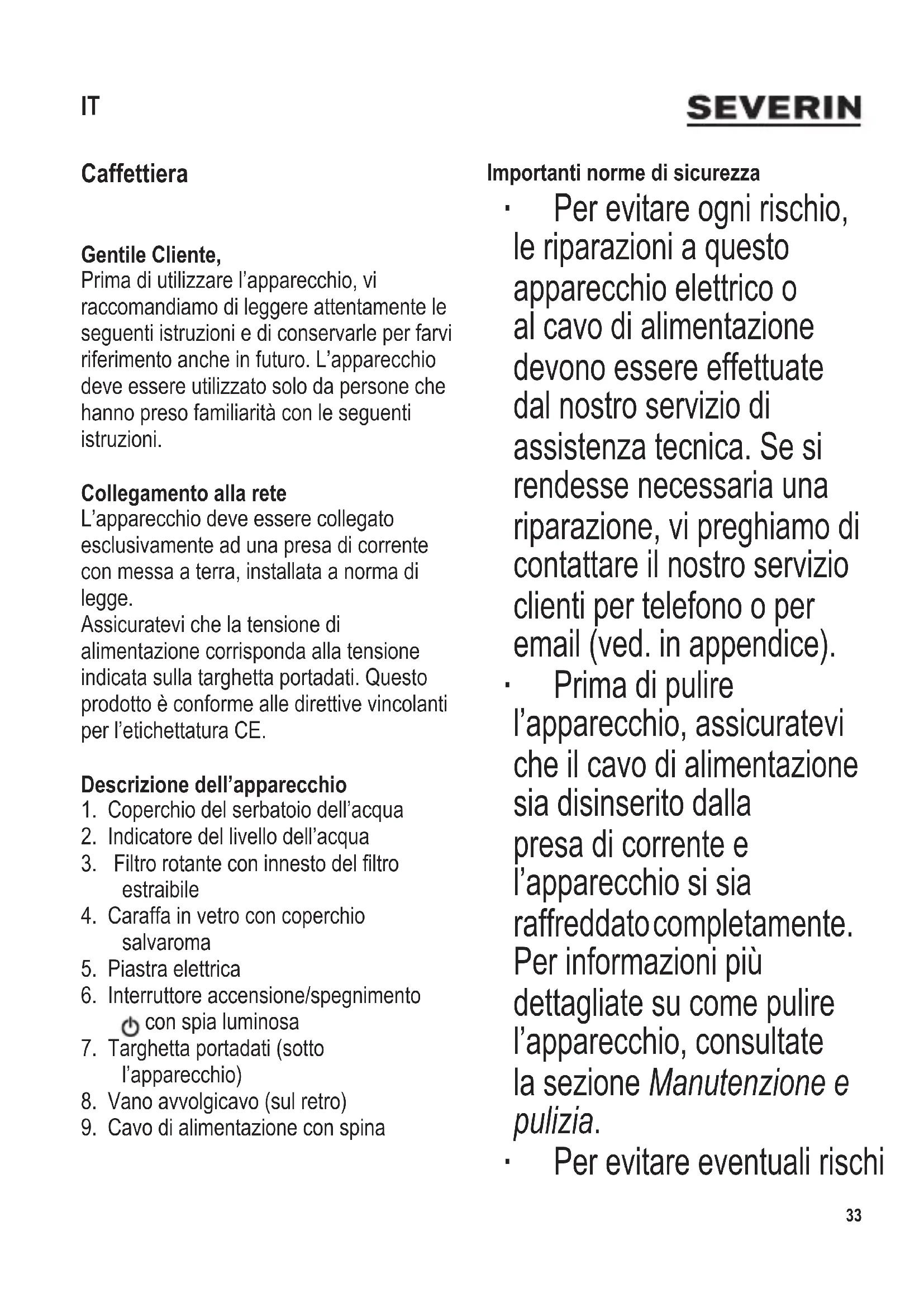 e siano comunque più grandi di 8 anni di età. ∙ L’apparecchio e il cavo di alimentazione devono essere tenuti sempre fuori della portata di bambini di età inferiore agli 8 anni. ∙ Avvertenza: Tutto il materiale di imballaggio deve essere tenuto fuori della portata dei bambini a causa del rischio potenziale esistente, per esempio di soffocamento. ∙ Prima di ogni utilizzo dell’apparecchio, controllate attentamente che l’apparecchio e gli accessori inseriti non presentino tracce di deterioramento. Se per esempio fosse caduto battendo suunasuperciedura,oseèstata usata una forza eccessiva nel tirare il cavo di alimentazione, l’apparecchio non va più usato: danni anche invisibili ad occhio nudo potrebbero comportare conseguenze negative sulla sicurezza nel funzionamento dell’apparecchio. ∙ Durante l’uso, la caffettiera va installata sopraadunasuperciepiana, antiscivolo e impermeabile agli spruzzi e alle macchie. ∙ Evitate che il cavo di alimentazione tocchifontidicaloreosupercicalde. ∙ Per evitare che l’acqua bollente o il vapore fuoriesca, spegnete la caffettiera e lasciate sempre raffreddare l’apparecchio prima di aprirlo o di rimuovere parti dell’apparecchio o qualcuno degli accessori. ∙ Non lasciate incustodito l’apparecchio mentre è collegato all’alimentazione elettrica. ∙ Disinserite sempre la spina dalla presa - in caso di cattivo funzionamento, - dopo l’uso, - prima di pulire l’apparecchio. ∙ Per disinserire la spina dalla presa di corrente, non tirate mai il cavo di alimentazione ma afferrate direttamente la spina. ∙ Non lasciate pendere liberamente il cavo di alimentazione; tenete il cavo lontano dalle parti dell’apparecchio soggette a riscaldarsi. ∙ Nessuna responsabilità verrà assunta in caso di danni risultanti da un uso errato o dalla non conformità alle istruzioni. Spegnimento automatico Per risparmiare energia, l’apparecchio (compresa la piastra elettrica) si spegnerà automaticamente dopo circa 35 minuti dopo il completamento del ciclo di infusione. Per il primo utilizzo Per preparare il caffè la prima volta, fate compiere all’apparecchio due o tre cicli di infusione utilizzando la quantità d’acqua massima indicata, senza però aggiungerci caffè macinato. Ripetete la stessa operazione anche dopo dei periodi prolungati di non utilizzo e dopo aver disincrostato dal calcare l’apparecchio.36 104 x 142 mm Informazioni generali ∙ Le tacche di misurazione presenti sul serbatoio dell’acqua e sulla caraffa in vetro facilitano l’operazione di riempimento del serbatoio con la giusta quantità di acqua. La scala di sinistra è per tazze di misura media di circa 125 ml, mentre quella di destra è utilizzata per tazze più piccole. Accertatevi sempre di non superare il livello massimo di quantità d’acqua. ∙ Se dovete eseguire diversi cicli di infusione consecutivi, vi raccomandiamo di spegnere la caffettiera dopo ogni ciclo e di lasciare raffreddare l’apparecchio per almeno 5 minuti. ∙ Osservazione importante: Se riempite l’apparecchio con acqua fresca subito dopo un precedente ciclo di infusione, c’è il pericolo di procurarsi scottature a causa dell’acqua calda o del vapore che fuoriesce. Preparazione del caffè ∙ Riempimento del serbatoio dell’acqua: Aprite il coperchio del serbatoio dell’acqua, riempite il serbatoio con la quantità di acqua desiderata e richiudete il coperchio. ∙ Inserimento del ltro di carta: Apriteilltrorotantelateralmenteeinserite sull’appositosupportounltroincarta1 x 4, ripiegandolo prima sui lati perforati delltro. ∙ Riempimento con caffè macinato: Per ogni tazza regolare (da 125 ml.), aggiungete un misurino di circa 6 g. (= 1½-2 cucchiaini) di caffè macinato nementeepoichiudeteilltrorotante. ∙ Preparazione della caraffa di vetro: Inseriteilltrosalvaromasullacaraffae poi sistemate la caraffa nell’apparecchio. Se il coperchio è inserito correttamente, durante il ciclo di infusione si disattiverà il meccanismo anti-goccia posto sul supporto delltro. ∙ Inizio del ciclo di infusione: Inserite la spina in una presa di corrente a muro adatta e azionando l’interruttore di accensione /spegnimento accendete la caffettiera.Ilciclodiltrazionehainizioe l’acquapassaattraversoilltro. ∙ Rimozione della caraffa di vetro: Aspettate che tutta l’acqua sia passata attraversoilltroprimadirimuoverela caraffa dall’apparecchio. ∙ Spegnimento della caffettiera: Potete tenere in caldo il caffè rimasto nella caraffa, lasciando la caraffa sulla piastra. Quando avrete versato anche l’ultima tazza di caffè, premete sul tasto per spegnere la caffettiera. A meno che non spegniate l’apparecchio manualmente, la piastra elettrica rimane calda per ancora 35 minuti circa dopo il ciclo di infusione, quando l’apparecchio si spegne automaticamente. Spegnete sempre l’apparecchio dopo l’uso e disinserite la spina dalla presa di corrente elettrica a muro.104 x 142 mm