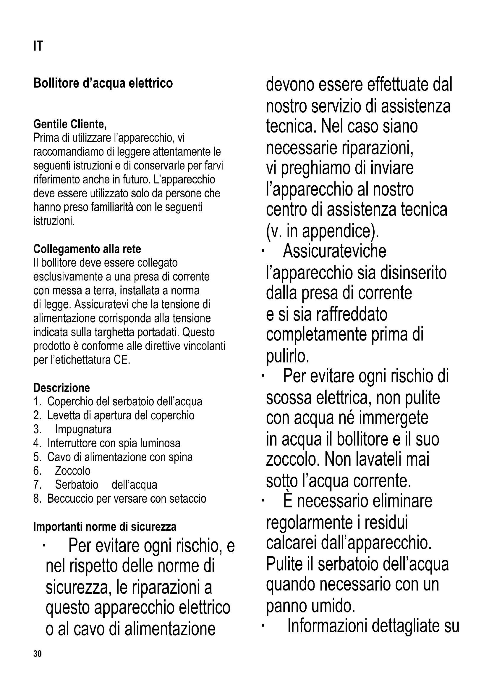 Importanti norme di sicurezza ∙ Per evitare ogni rischio, e nel rispetto delle norme di sicurezza, le riparazioni a questo apparecchio elettrico o al cavo di alimentazione devono essere effettuate dal nostro servizio di assistenza tecnica. Nel caso siano necessarie riparazioni, vi preghiamo di inviare l’apparecchio al nostro centro di assistenza tecnica (v. in appendice). ∙ Assicuratevi che l’apparecchio sia disinserito dalla presa di corrente e si sia raffreddato completamente prima di pulirlo. ∙ Per evitare ogni rischio di scossa elettrica, non pulite con acqua né immergete in acqua il bollitore e il suo zoccolo. Non lavateli mai sotto l’acqua corrente. ∙ È necessario eliminare regolarmente i residui calcarei dall’apparecchio. Pulite il serbatoio dell’acqua quando necessario con un panno umido. ∙ Informazioni dettagliate su IT31 come pulire l’apparecchio sono riportate nella sezione Manutenzione e pulizia. ∙ Il presente apparecchio può essere usato da bambini (di almeno 8 anni di età) e da persone con ridotte capacità fi siche, sensoriali o mentali, o da persone senza particolari esperienze o conoscenze, purché siano sotto sorveglianza o siano state date loro istruzioni sull’uso dell’apparecchio e comprendano pienamente i rischi e le precauzioni di sicurezza che l’apparecchio comporta. ∙ Ai bambini non deve essere consentito di giocare con l’apparecchio. ∙ Ai bambini non deve essere consentito di effettuare operazioni di pulizia o di manutenzione sull’apparecchio a meno che non siano supervisionati da un adulto e siano comunque più grandi di 8 anni di età. ∙ L’apparecchio e il cavo di alimentazione devono essere tenuti sempre fuori della portata di bambini di età inferiore agli 8 anni. ∙ Questo apparecchio è studiato per il solo uso domestico o per impieghi simili, come per esempio - in cucine per il personale, negozi, uffi ci e altri ambienti simili di lavoro, - in aziende agricole, - da clienti di alberghi, motel e sistemazioni simili, - da clienti di pensioni “bed- and-breakfast” (letto & colazione). ∙ Le superfi ci esterne diventano molto calde durante il funzionamento e rimangono calde anche per un certo tempo dopo. ∙ Non lasciate incustodito il bollitore mentre è32 in funzione. Utilizzate esclusivamente dell’acqua pulita e osservate sempre i segni di minimo (0,5 l) / massimo (1,0 l) del livello dell’acqua durante il riempimento del serbatoio dell’acqua. L’eccessivo riempimento del serbatoio potrebbe risultare pericoloso perché potrebbe verifi carsi la fuoriuscita di acqua bollente. ∙ Attenzione anche al vapore che fuoriesce dal bollitore, potrebbe provocare scottature. Durante l’uso non toccate quindi nessuna parte dell’apparecchio, ma soltanto l’impugnatura. ∙ Attenzione: Il coperchio deve sempre rimanere chiuso durante il processo di ebollizione e mentre versate l’acqua bollente. ∙ Il bollitore può essere utilizzato soltanto con lo zoccolo fornito in dotazione. ∙ Non togliete mai dallo zoccolo (o non riponete sullo zoccolo) il contenitore dell’acqua mentre l’apparecchio è acceso. ∙ I collegamenti elettrici dello zoccolo devono sempre rimanere protetti da qualsiasi contatto con l’acqua. ∙ Avvertenza: Il cattivo uso può essere causa di gravi lesioni alla persona. ∙ Avvertenza: Tutto il materiale di imballaggio deve essere tenuto fuori della portata dei bambini a causa del rischio potenziale esistente, per esempio di soffocamento. ∙ Prima di ogni utilizzo dell’apparecchio, controllate attentamente che l’apparecchio e gli accessori inseriti non presentino tracce di deterioramento. Se per esempio fosse caduto battendo su una superfi cie dura, o se è stata usata una forza eccessiva nel tirare il cavo di alimentazione, l’apparecchio non va più usato: danni anche invisibili ad occhio nudo potrebbero comportare conseguenze negative sulla sicurezza nel funzionamento dell’apparecchio. ∙ L’apparecchio deve essere utilizzato esclusivamente sopra una superfi cie piana, resistente al calore.33 ∙ Non mettete in funzione l’apparecchio sotto armadietti pensili o oggetti simili: esiste il rischio che il vapore emesso crei della condensa sotto il pensile. ∙ Non poggiate mai l’apparecchio e il cavo di alimentazione sopra fi amme libere o superfi ci riscaldanti (es. fornelli a gas o piastre elettriche). ∙ Non lasciate pendere sciolto il cavo di alimentazione e tenetelo lontano dagli elementi caldi dell’apparecchio. ∙ Disinserite sempre la spina dalla presa - dopo l’uso, - in caso di cattivo funzionamento, - prima di pulire l’apparecchio. ∙ Nessuna responsabilità verrà assunta in caso di danni risultanti da un uso errato o dalla non conformità alle istruzioni. Interruzione termica automatica Il dispositivo preimpostato di interruzione termica automatica protegge l’elemento riscaldante contro il surriscaldamento nel caso l’apparecchio sia stato attivato senza aver aggiunto acqua o se la piastra riscaldante è incrostata di calcare. Se è intervenuto il dispositivo di interruzione automatica, l’apparecchio dovrà avere il tempo di raffreddarsi completamente o dovrà essere disincrostato dal calcare prima di essere riacceso. Primo utilizzo Per assicurare una pulizia totale, eseguite un primo ciclo di bollitura ed eliminate quindi quest’acqua, prima di procedere al primo utilizzo. Ebollizione dell’acqua ∙ Togliete il serbatoio dell’acqua dal suo zoccolo. ∙ Premete la levetta di apertura del coperchio sull’impugnatura e aprite il coperchio; riempite il serbatoio di acqua sino al livello desiderato, rispettando però i segni di Min (0,5 l) e di Max (1,0 l). ∙ Chiudete il coperchio e sistemate il serbatoio dell’acqua sullo zoccolo. ∙ Inserite la spina in un’apposita presa di corrente a muro e premete l’interruttore. La spia luminosa si accende. ∙ Ha inizio la fase di bollitura. Una volta raggiunto il punto d’ebollizione, l’apparecchio
